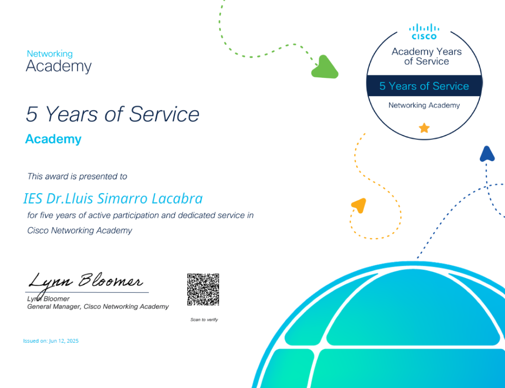 La insígnia de 5 anys de servei reconeix una acadèmia pel seu compromís continu amb Cisco Networking Academy i per oferir cursos del portafoli als seus alumnes. La insígnia també reconeix l’impacte creixent de l’acadèmia en els alumnes i les comunitats.