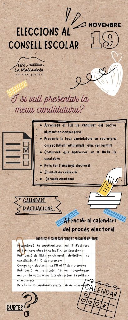a presentar les seues candidatures, d’acord al calendari d’actuacions del procés electoral, i així col·laborar i participar de forma activa en la vida i pressa de decisions del centre.