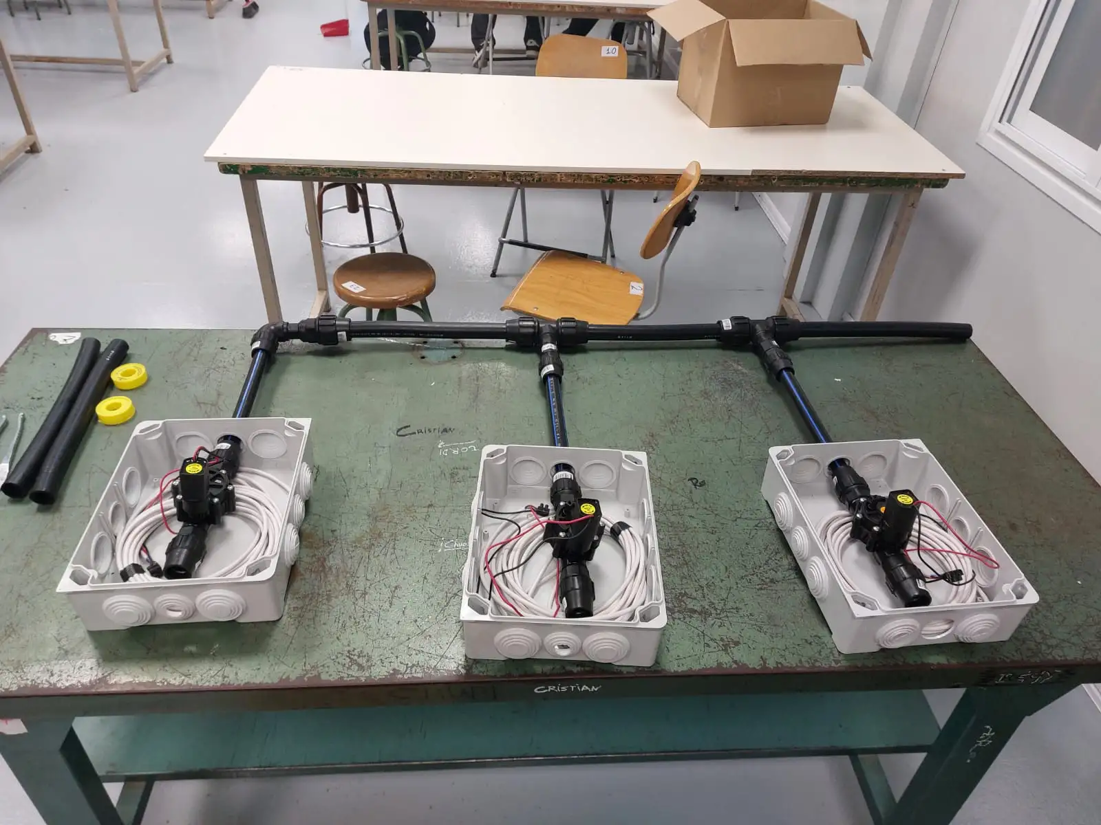 L’alumnat de primer curs de FPB d’Electricitat i Electrònica amb la direcció del seu professor Sergio Selles ha participat en el muntatge del col·lector d’eixida del dipòsit d’aigua, instal·lant les electrovàlvules que permetran controlar el sistema de reg del projecte OASI. Amb aquesta activitat, els estudiants col·laboren en una part clau de la instal·lació, aplicant … Llegir més