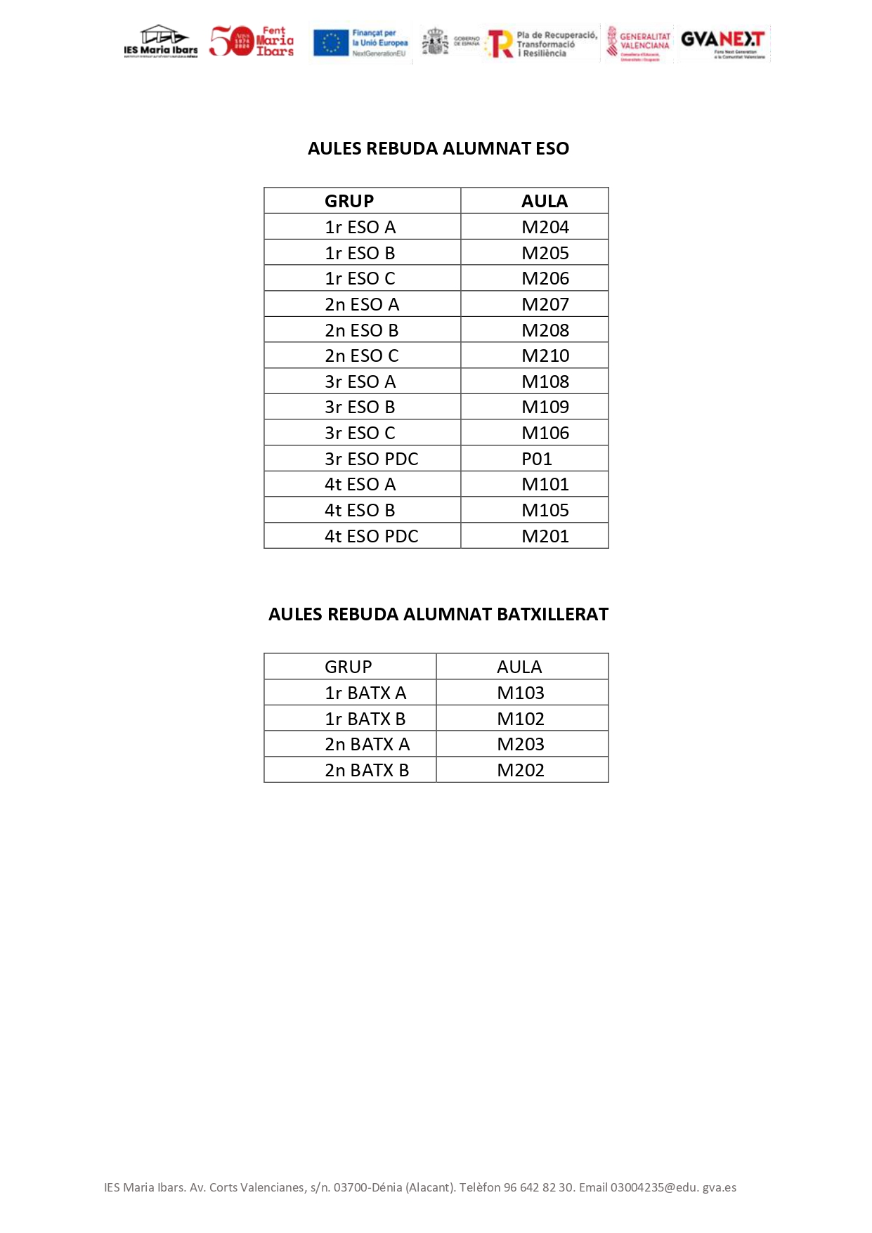 - 9:30 h Alumnat de 1r de Batxillerat (Biblioteca)