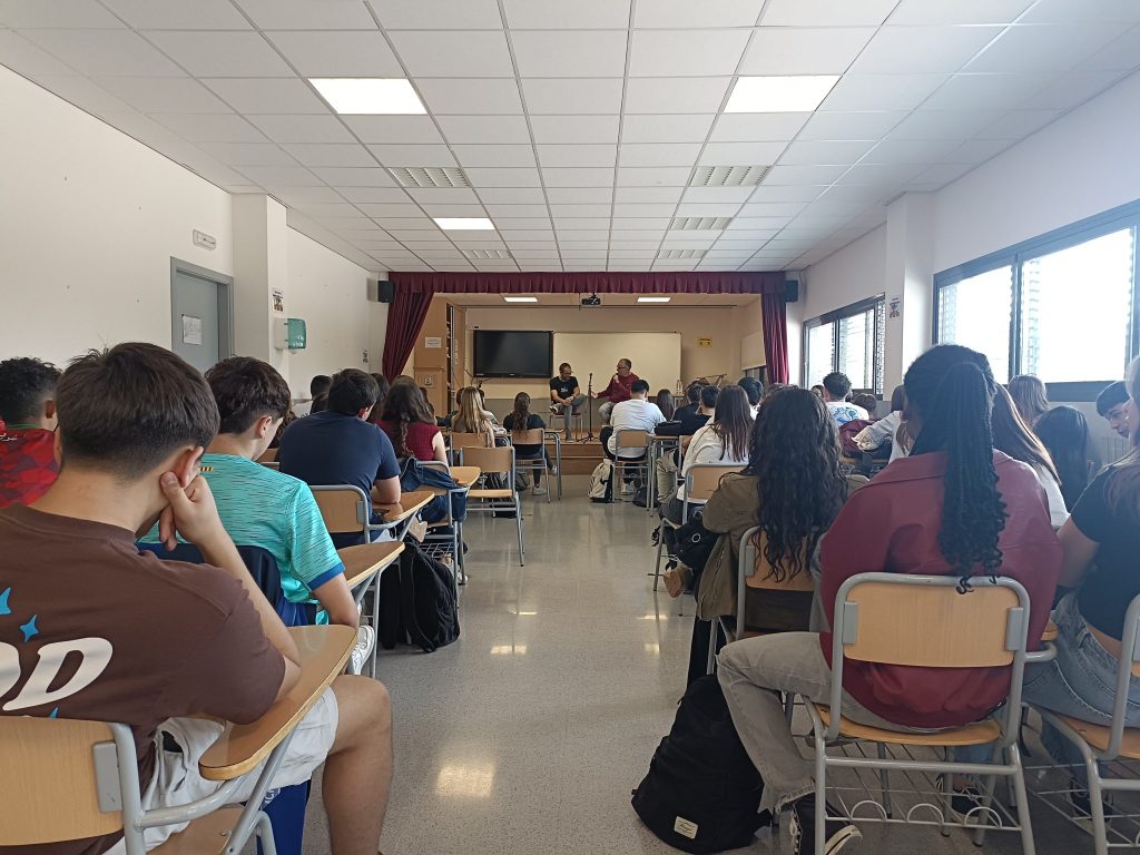 Xavi Sarrià va acudir al centre per oferir una xarrada sobre el seu llibre Històries del Paradís, tot compartint també la seua trajectòria artística com a cantant i escriptor. Va estar presentat i acompanyat per Gaspar López, professor de Valencià del centre i membre del grup musical Sant Gatxo.