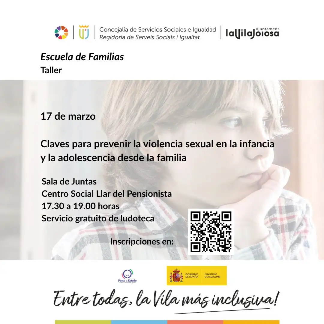 TALLERClaves para prevenir la violencia sexual en la infancia y adolescencia desde la familiaPonente: María Marqués Chover, psicóloga jurídica y forense especializada en victimología.17 de marzo de 2026. De 17.30 a 19.00 h.Sala de Juntas (segunda planta) Centro Social Llar del Pensionista.