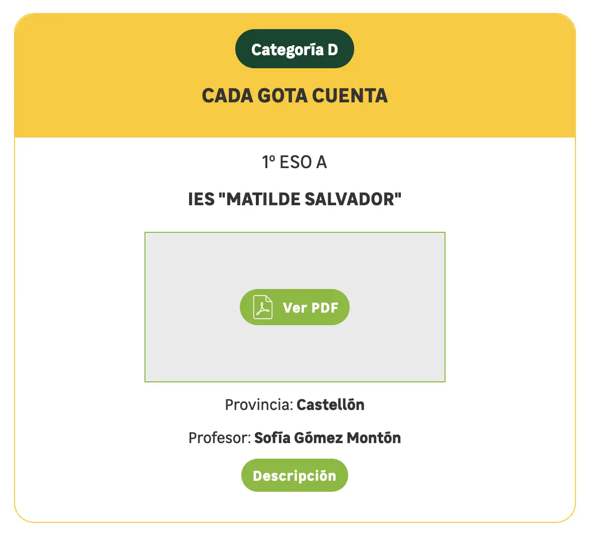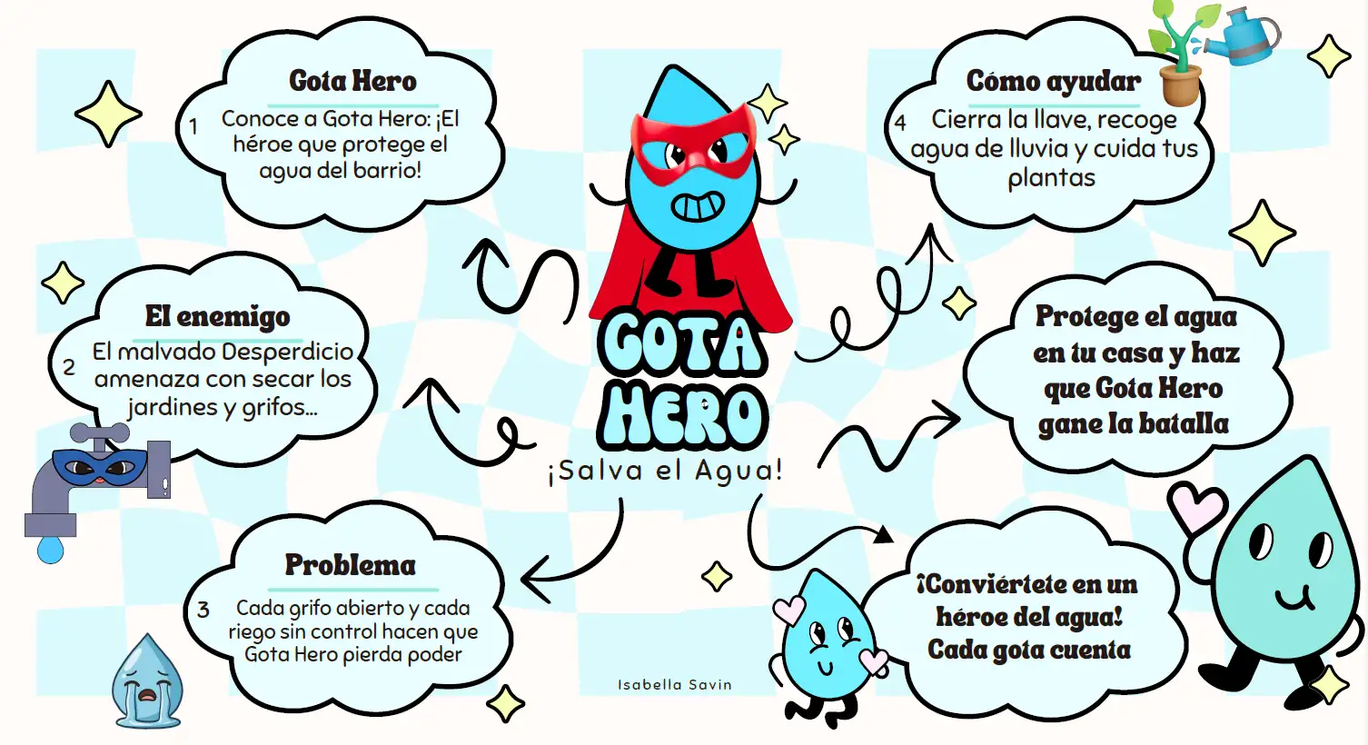 Els alumnes Álex Saura, Nacho Pajares i Edurne Pacheco han participat amb el seu repte sostenible, una proposta que desenrotllen de manera voluntària des de la matèria de Tecnologia. Així mateix, Isabella Savin ha contribuït amb “Gota Hero”, un pòster explicatiu orientat als cursos més xicotets.