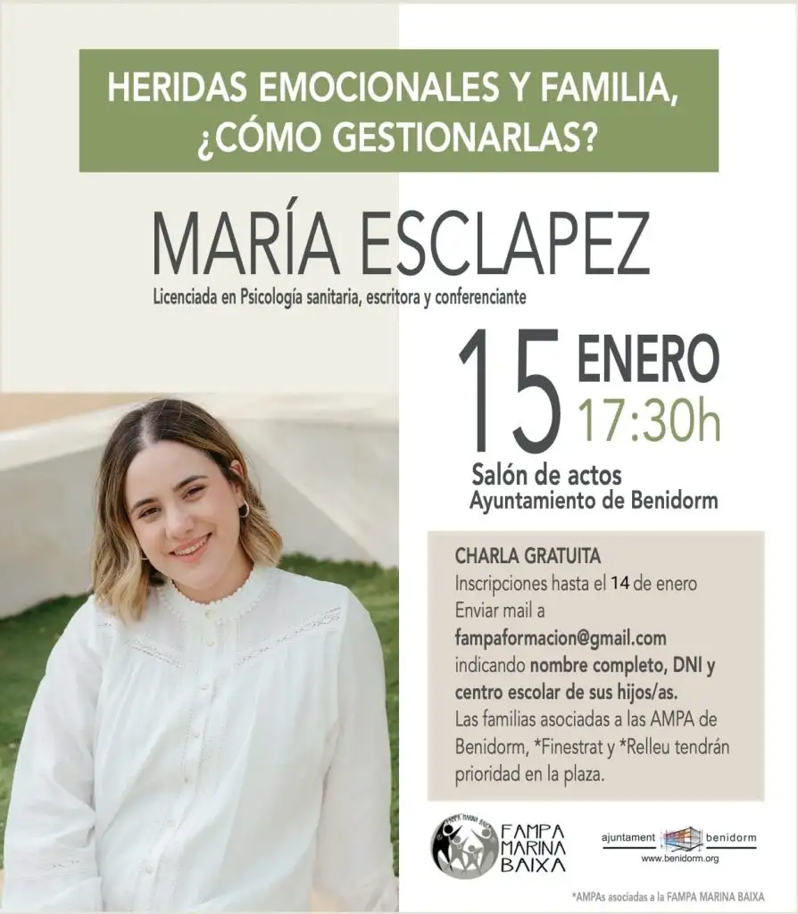 La FAMPA MARINA BAIXA «Federación de padres y madres de Benidorm y comarca» organiza en colaboración con el Ayuntamiento de Benidorm la charla «HERIDAS EMOCIONALES Y FAMILIA ¿Cómo gestionarlas?» La charla estará a cargo de la Psicóloga sanitaria María Esclapez especializada en psicología clínica y de la salud, escritora y conferenciante.