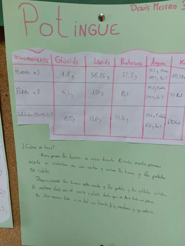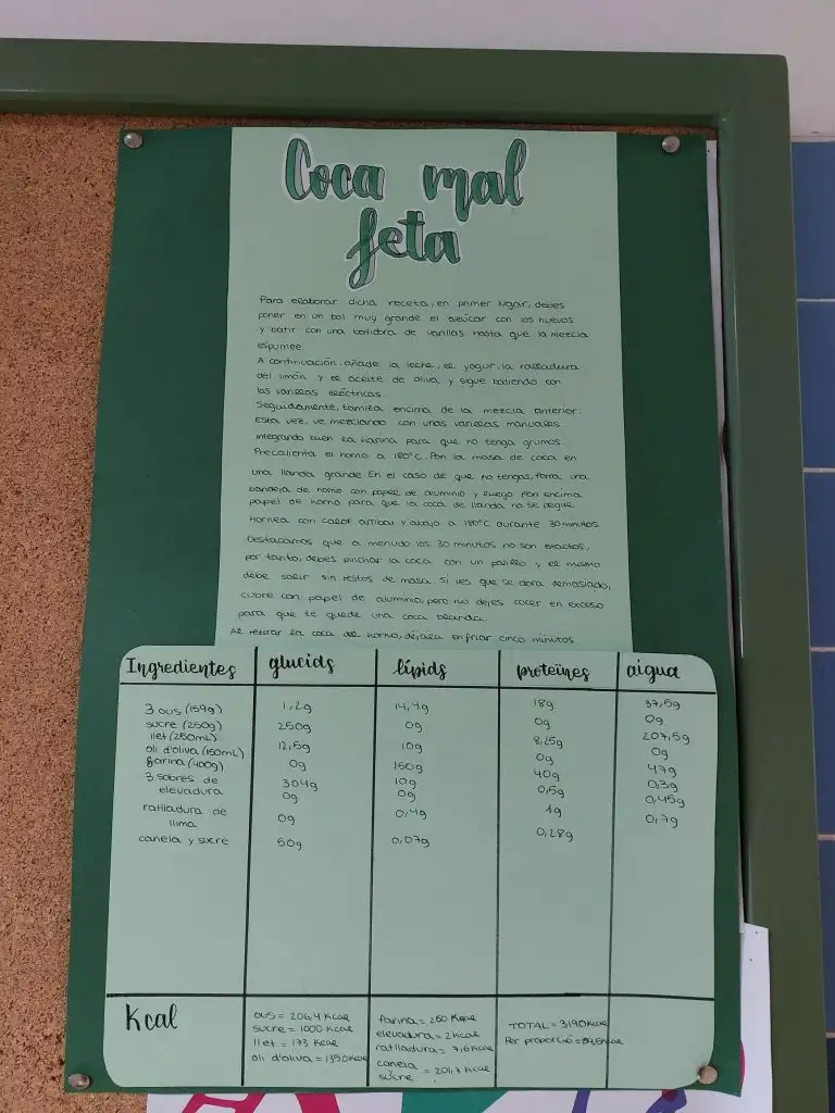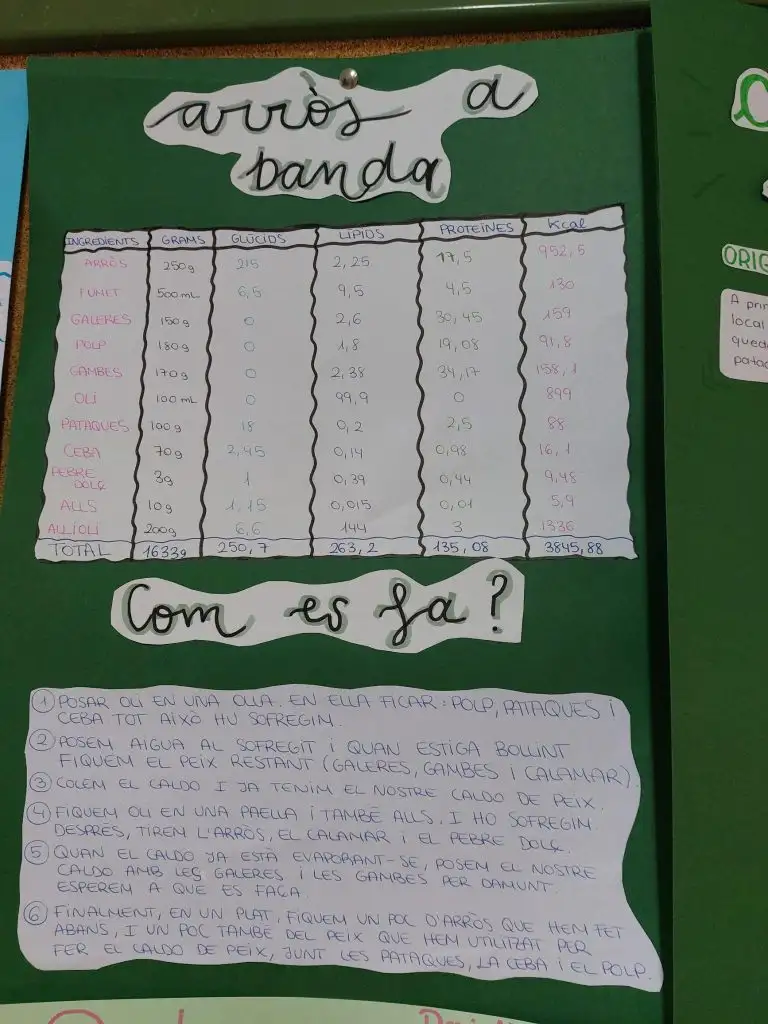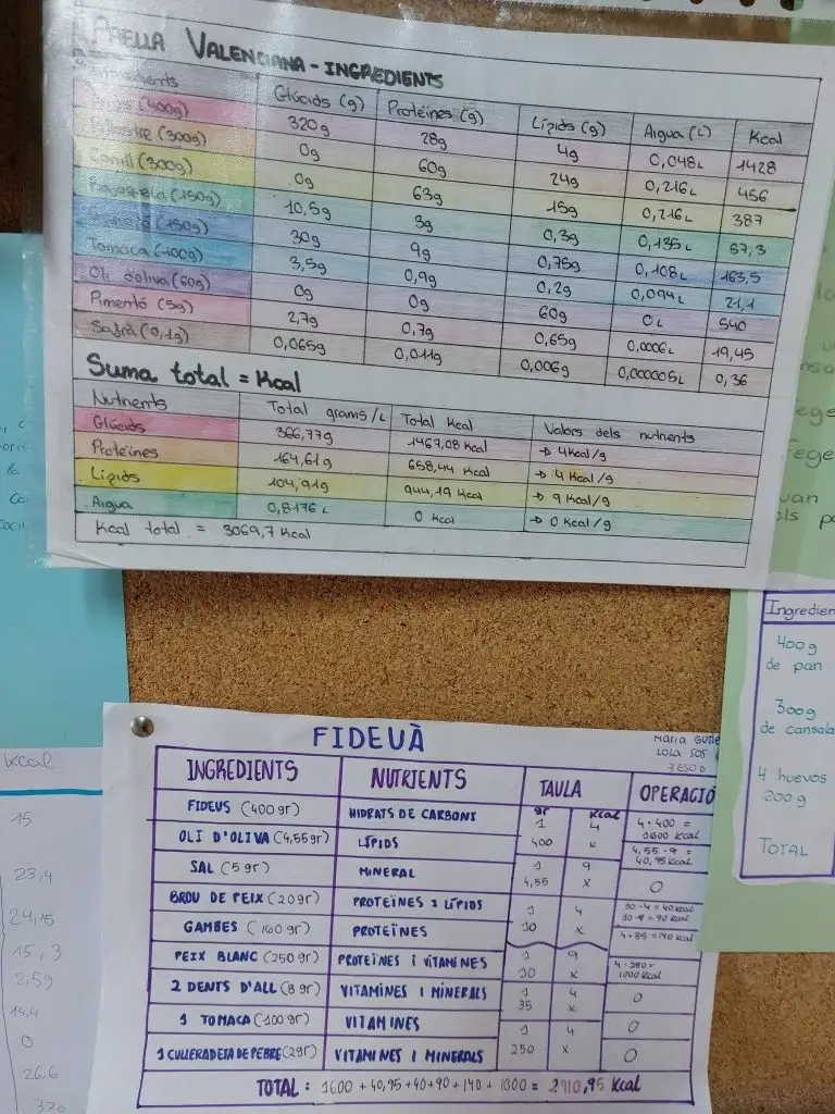 A continuació, s’han calculat les calories totals de cada plat i la contribució energètica de cada tipus de nutrient, aplicant els coneixements treballats a classe sobre nutrició, valor energètic dels aliments i alimentació equilibrada. Aquest procés ha permès a l’alumnat comprendre millor la relació entre alimentació, energia i salut, al mateix temps que desenvolupava habilitats matemàtiques, d’anàlisi i de raonament científic.