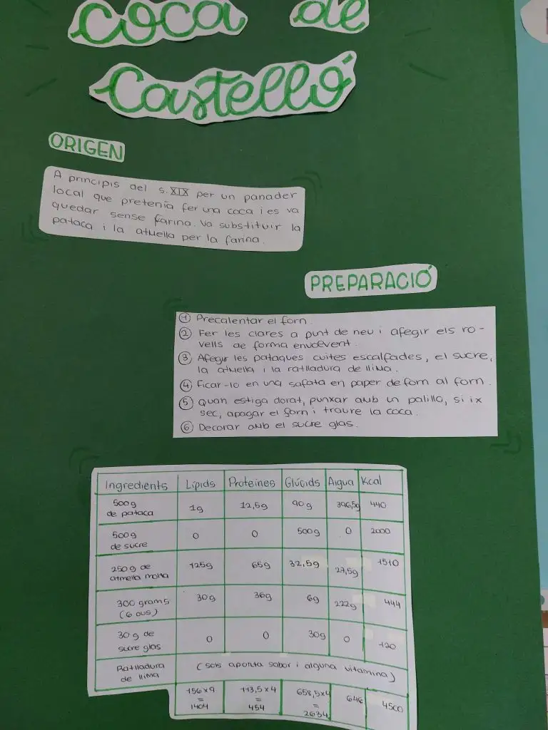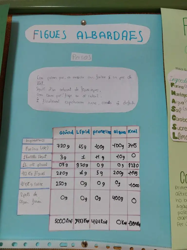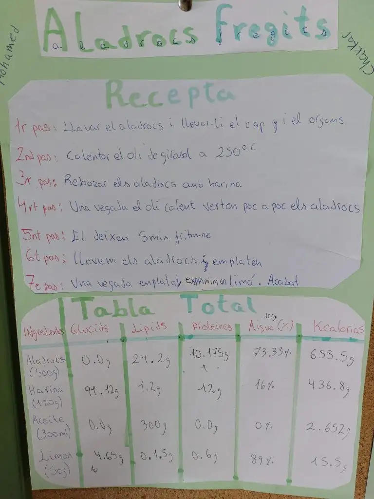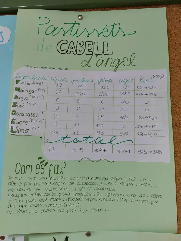 A continuació, s’han calculat les calories totals de cada plat i la contribució energètica de cada tipus de nutrient, aplicant els coneixements treballats a classe sobre nutrició, valor energètic dels aliments i alimentació equilibrada. Aquest procés ha permès a l’alumnat comprendre millor la relació entre alimentació, energia i salut, al mateix temps que desenvolupava habilitats matemàtiques, d’anàlisi i de raonament científic.