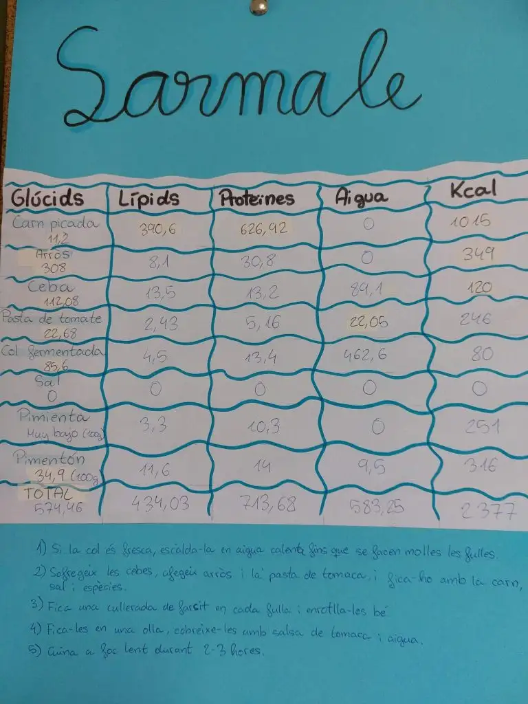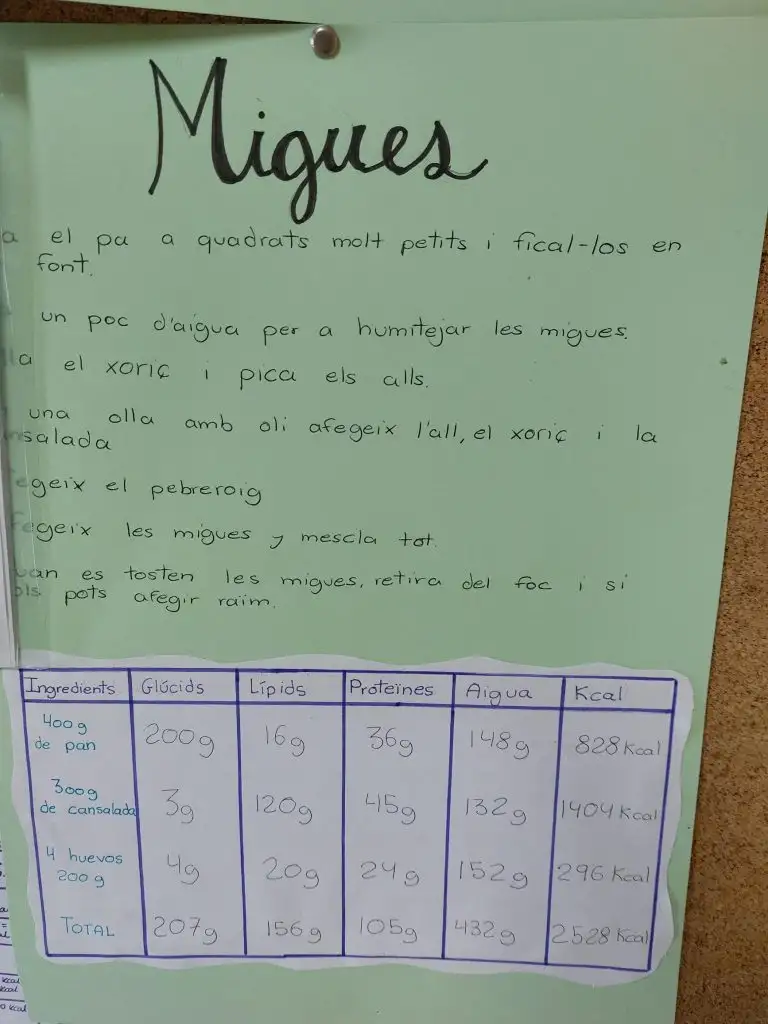 Des del punt de vista científic, s’ha dut a terme una anàlisi nutricional de cada recepta. En primer lloc, s’ha calculat la massa de cada ingredient en grams. A partir d’aquestes dades, l’alumnat ha identificat els principals nutrients presents en cada plat —glúcids, lípids i proteïnes— així com la quantitat d’aigua aportada pels diferents ingredients.