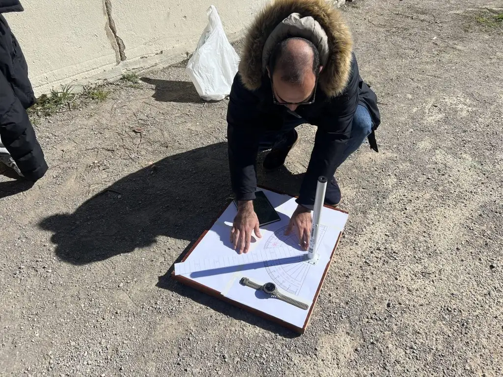 Tant la proposta d’Eratòstenes com la nostra, l’experiment consisteix a analitzar l’ombra que produeix un pal prop del moment de l’equinocci (21/03/26).