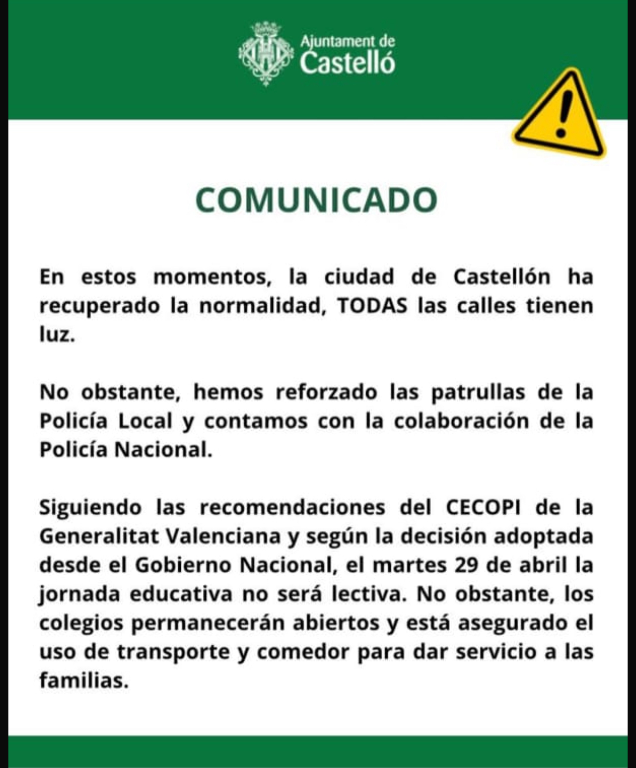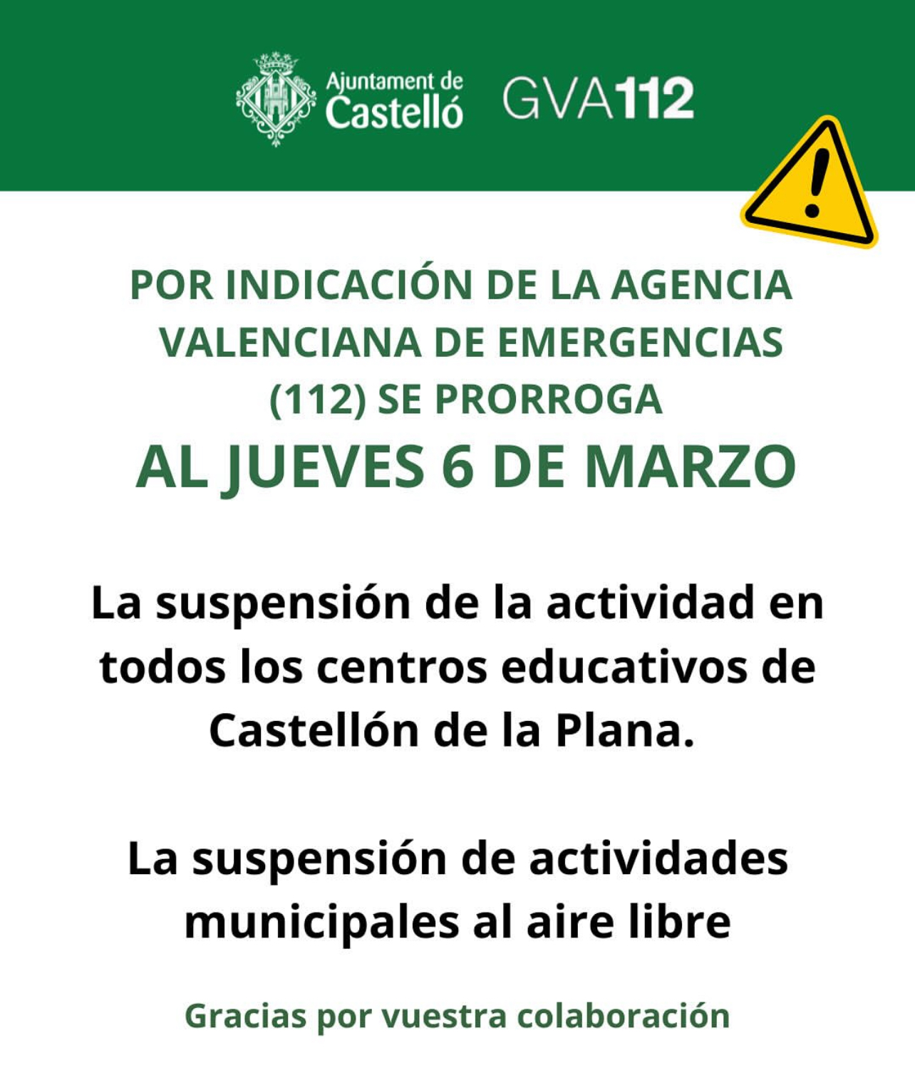 Con motivo del comunicado recientemente emitido por la Agencia Valenciana de Seguridad y Respuesta a las Emergencias de la Conselleria de Emergencias e Interior de la Generalitat Valenciana, en el que se recomienda la suspensión de las actividades escolares y educativas, este Ayuntamiento, una vez reunido el CECOPAL de la ciudad de Castellón de la Plana, ha considerado decretar la suspensión de las actividades escolares y educativas los días 4 y 5 de marzo.