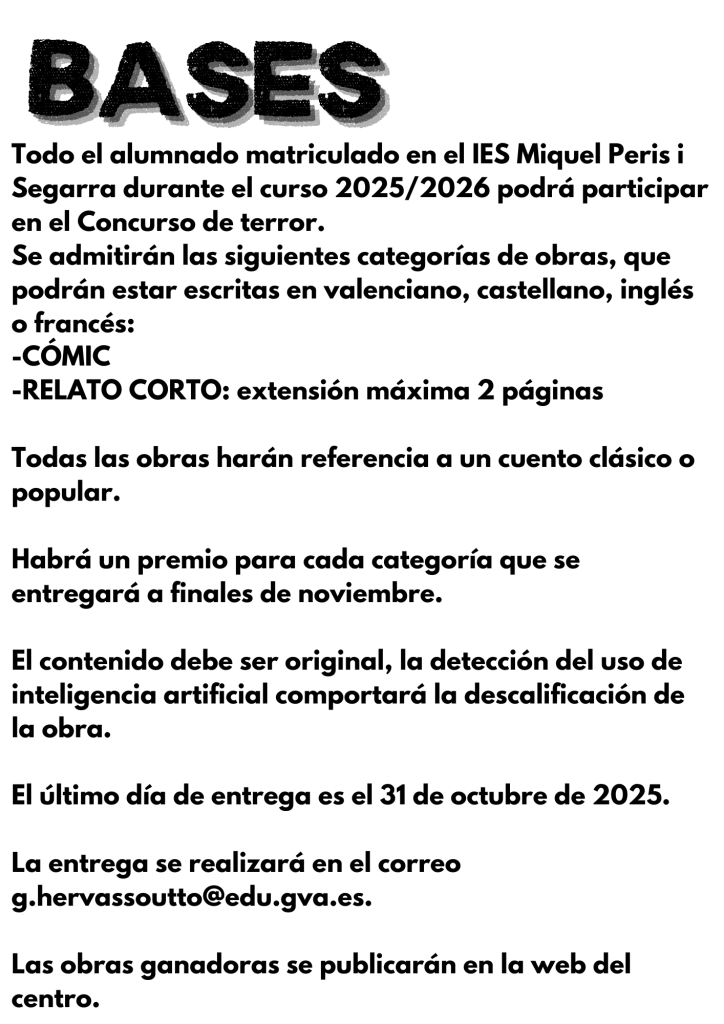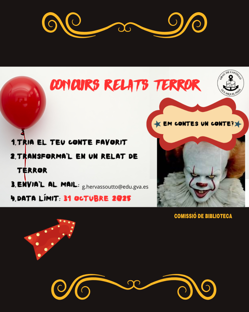 Este año, bajo la temática «Cuéntame un Cuento», toda la comunidad educativa del IES MIQUEL PERIS I SEGARRA hemos sido testigos de vuestras historias que nos han hecho temblar. Desde la Comissió de la Biblioteca hemos podido disfrutar de vuestra forma de transformar un cuento tradicional en una historia aterradora.