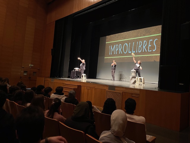 Aquest matí, el nostre alumnat ha gaudit de la interpretació teixida al voltant de la improvisació dels autors i amb el fil conductor de la literatura. De fet, son els i les alumnes els que amb la seua experiència literària, com per exemple, títols de llibres o frases mítiques literàries,  guien l’elenc que desenvolupen històries d’allò més vibrants.
