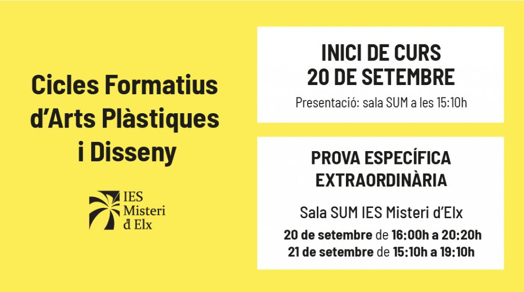 - Proves específiques accés Cicles – convocatòria extraordinària curs 25/26Proves específiques per a l’accés a Cicles Formatius d’Arts Plàstiques i Disseny Convocatòria extraordinària curs 25/26 Els informem que les proves d’accés es realitzaran l’11 de setembre a les 8.00 h. Així mateix, els comuniquem … Llegir més