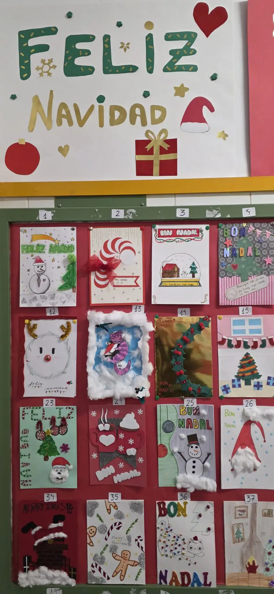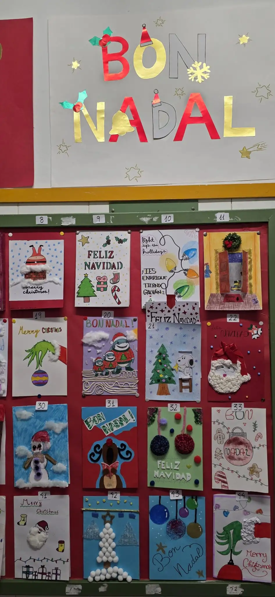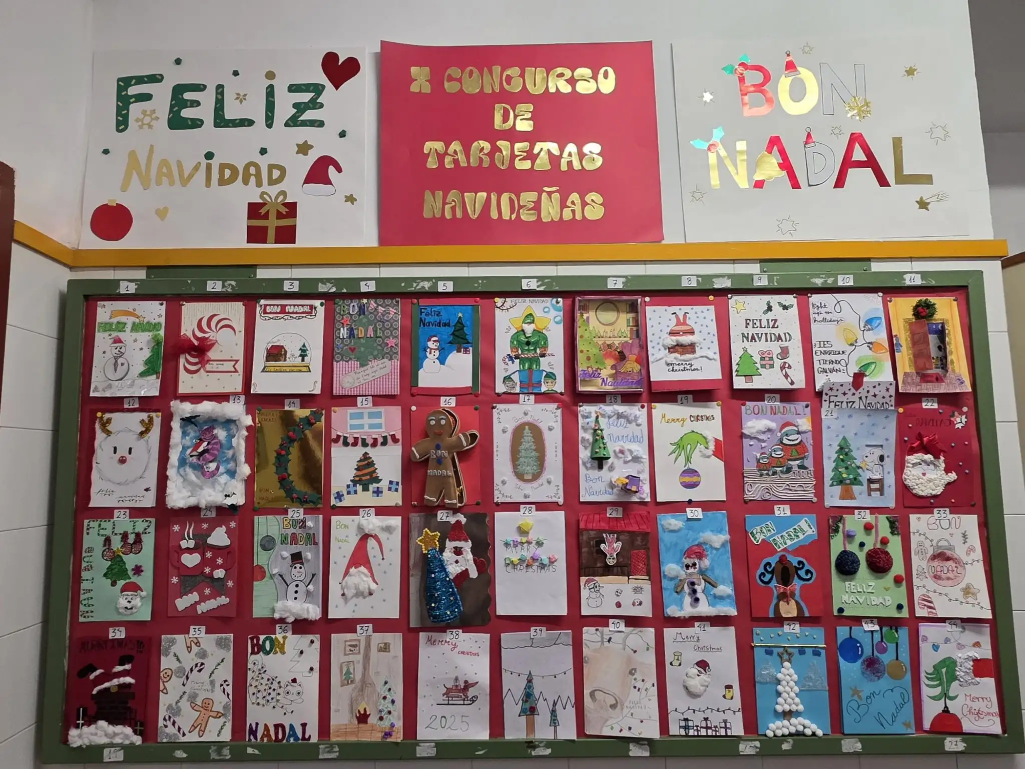Celebramos en el centro la décima edición del Concurso de Tarjetas de Navidad, organizado por el Departamento de Artes Plásticas. Este año han sido expuestas 118 tarjetas. Las tres tarjetas más votadas por la comunidad educativa han sido las ganadoras; primer premio ex aequo para la tarjeta nº 16, de Joan Cuevas, de 4º ESO grupo C, y para la tarjeta nº 100, de Laura Garrido, de 3º ESO grupo PDC. Segundo premio para la tarjeta nº 7 de Agustina Fernández, de 3º ESO grupo B. El regalo de los premios es material escolar y un diploma que se entregará el día 22 de diciembre en el concierto de Navidad.