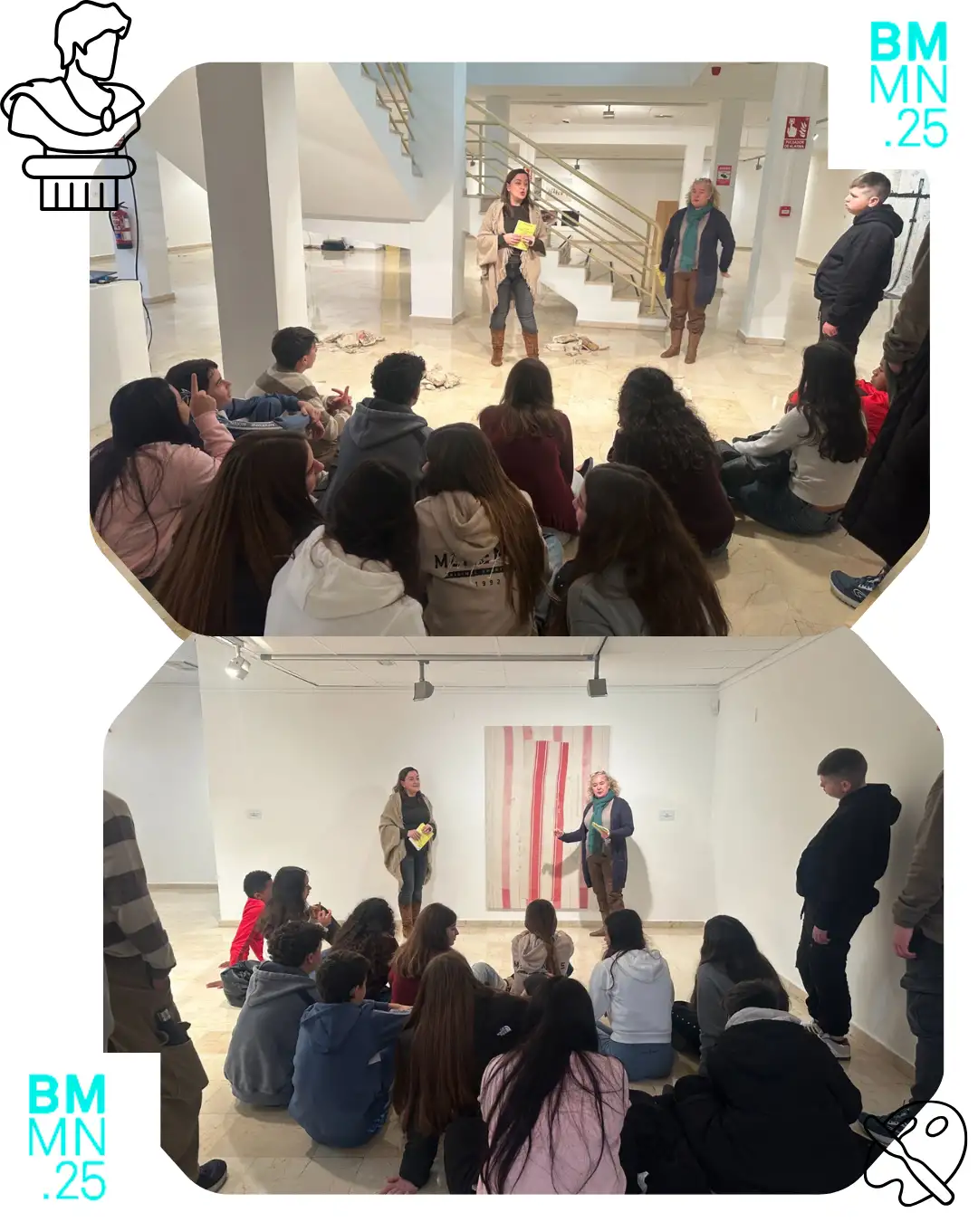 A la nostra arribada, dos representants de l’Ajuntament ens van donar la benvinguda i van oferir al grup una explicació detallada i accessible sobre les obres exposades. Entre elles, destaquen les dues peces premiades enguany, centrades en temes de gran rellevància social: la memòria obrera i la tragèdia de la *Dana.