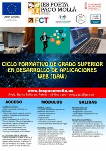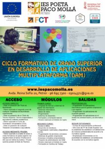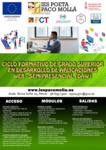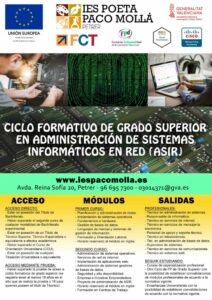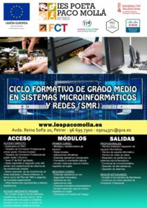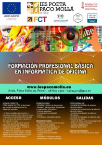 Puedes descargar el catálogo formativo de ciclos formativos desde aquí: https://portal.edu.gva.es/iespacomolla/wp-content/uploads/sites/638/2025/03/Oferta-Formativa-IES-Paco-Molla-Curso-2023-24_compressed.pdf