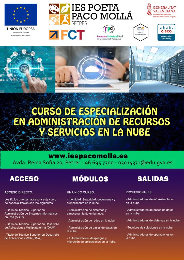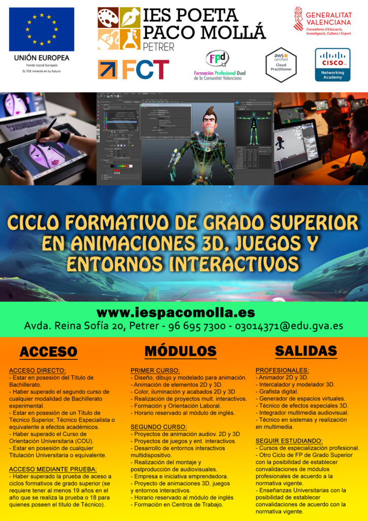 Ciclos de FPB, Grado Medio (SMR), Grado Superior (ASIR, DAM, DAW y Animación 3D) y Cursos de Especialización en Videojuegos y Cloud Computing