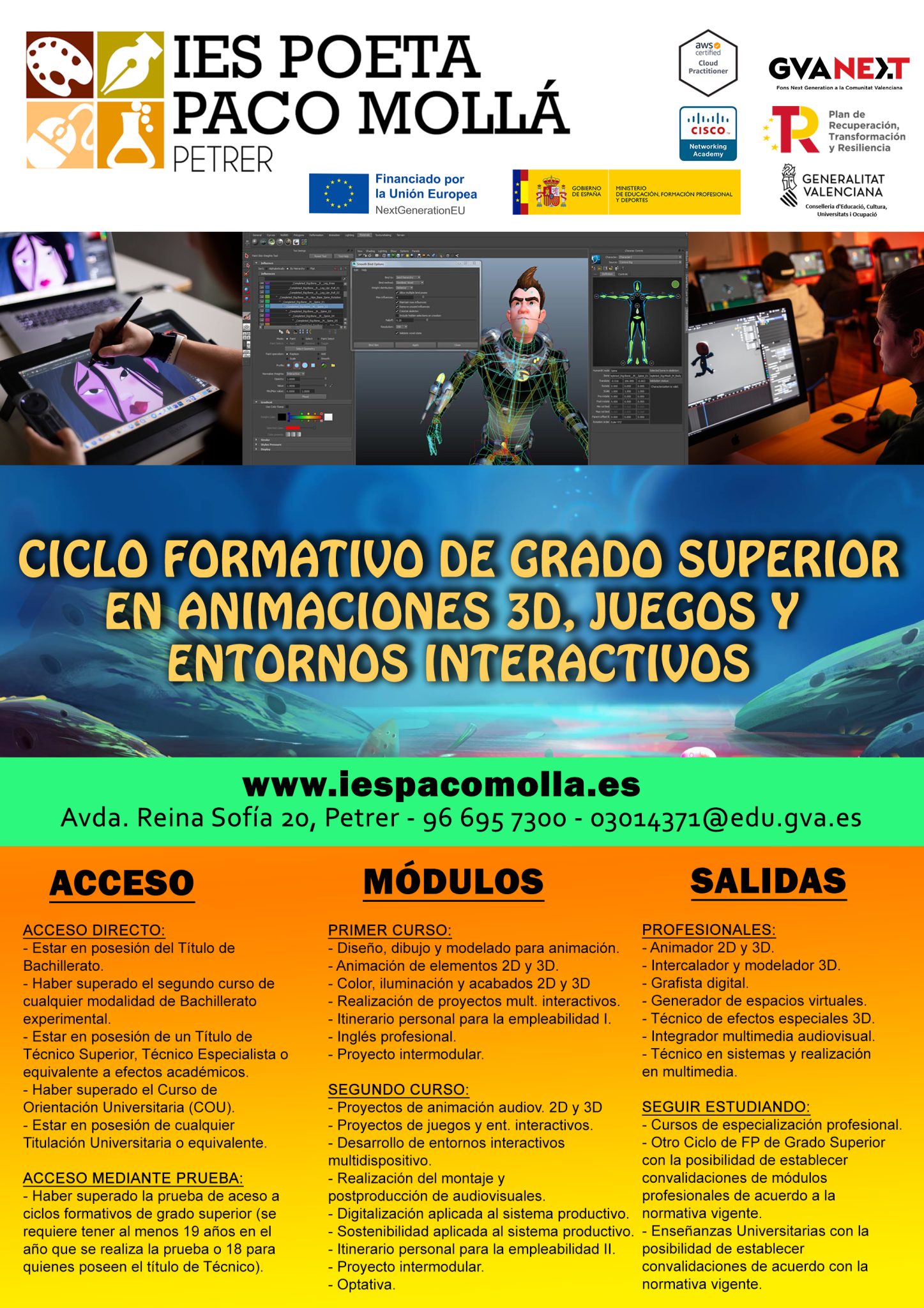 Ciclos de FPB, Grado Medio (SMR), Grado Superior (ASIR, DAM, DAW y Animación 3D) y Cursos de Especialización en Videojuegos y Cloud Computing