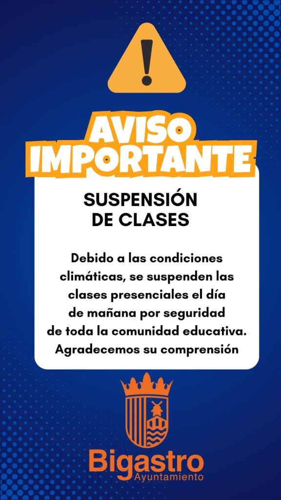 Debido a las condiciones meteorológicas, y siguiendo las recomendaciones de las autoridades competentes, les informamos que MAÑANA, MARTES 30 DE SEPTIEMBRE, SE SUSPENDEN LAS CLASES.