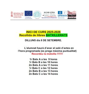 - Recollida de llibres de Batxillerats, el dilluns 8 de setembreRecollida llibres Batxillerat
