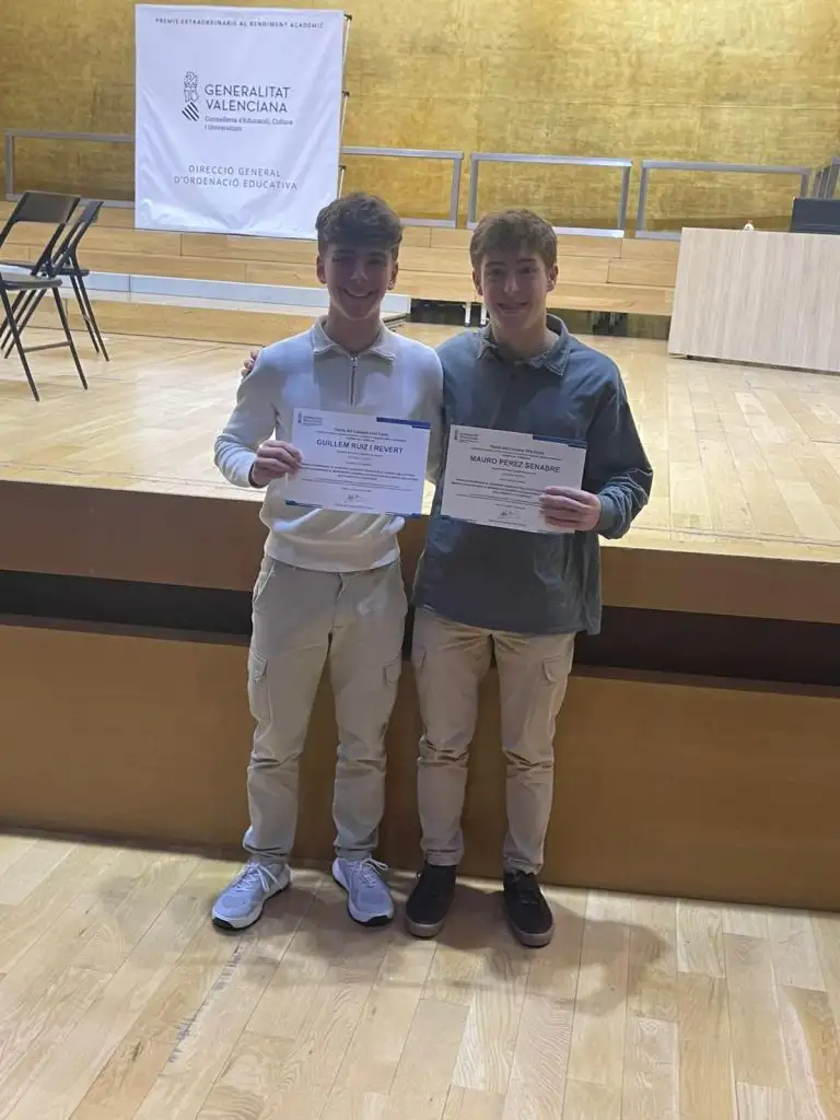 Els nostres alumnes Mauro Pérez Senabre i Guillem Ruiz i Revert han rebut el premi extraordinari d’Educació Secundària de la GVA 2025. És un reconeixement enorme al seu esforç, constància i manera de ser dins i fora de l’aula. Un orgull que compartim com a comunitat educativa.