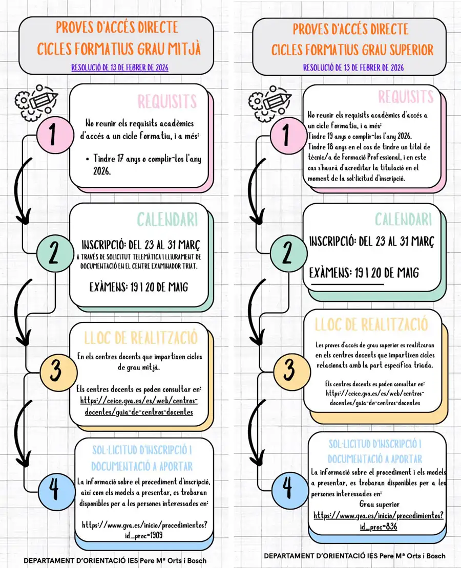 L’IES Pere M.ª Orts i Bosch informa a tota la comunitat educativa sobre la convocatòria de les proves d’accés directe als Cicles Formatius de Grau Mitjà i Grau Superior.