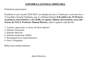 Ens dirigim a vosaltres per a convocar-vos a l’Assemblea General Ordinària que se celebrarà el pròxim DIMECRES 14 de SETEMBRE de 2022 a les 19,30 hores, a la Sala de Conferències de l’IES Professor Manuel Broseta, amb el següent ordre del dia: