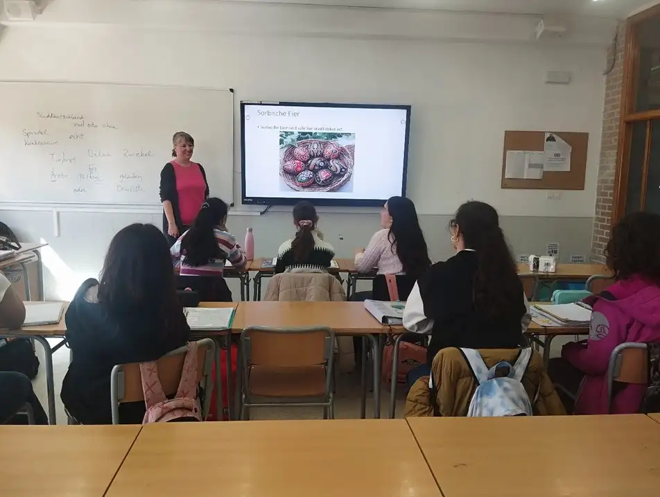 El passat divendres 13 de març l’alumnat de l’assignatura optativa d’alemany de 4t d’ESO van comptar amb la visita d’una alemanya nativa. Durant la sessió l’alumnat va poder formular-li preguntes sobre diversos aspectes culturals del seu país, i ella també els va oferir una explicació dels trets més distintius de la celebración de la Pasqua a Alemanya. Ells també li van informar del més típic de la Pasqua a Banyeres: la mona, les processons, etc. Tots van gaudir d’una experiència inoblidable.