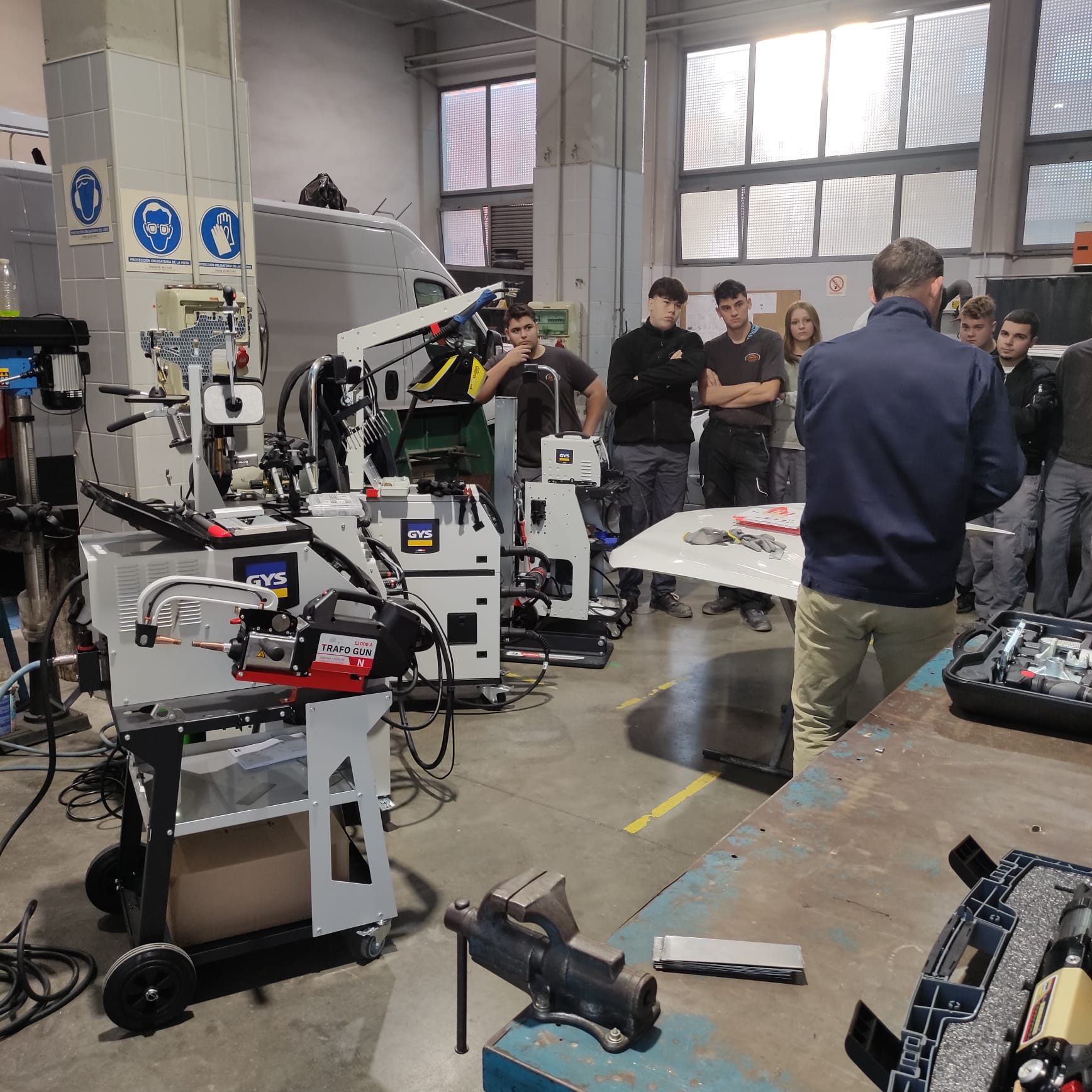 Desde el departamento de Automoción del IES Politècnic, queremos agradecer la colaboración que nos ha brindado la empresa GYS, y en especial a su técnico Anthony Moussu, que el pasado jueves 5 de diciembre, visito nuestro centro. Anthony mostró a nuestros alumnos del ciclo de Carrocería, las novedades y ventajas de las máquinas y herramientas de la marca GYS, y en especial las dedicadas a la reparación del aluminio, material cada vez más presente en las carrocerías actuales. Nuestros alumnos pudieron conocer las características y comprobar el uso y funcionamiento de las máquinas de soldadura, desabolladoras, remachadoras y de inducción actuales del fabricante GYS, gracias a las explicaciones y demostraciones que realizó Anthony. Para nosotros estas colaboraciones son muy valiosas porque los expertos como Anthony, y fabricantes como GYS, que aportan y comparten con nosotros, de forma desinteresada y con mucha profesionalidad, sus innovaciones y explicaciones técnicas de uso y trabajo con sus equipos, enriquecen el nivel de conocimientos de nuestros alumnos/as, y los preparan mejor para su futura vida profesional, que es el objetivo principal que tenemos en nuestro departamento. Empresas como GYS y técnicos como Anthony Moussu, nos ayudan en este proceso de formación de nuestros futuros carroceros/as. Mil gracias por vuestra colaboración.
