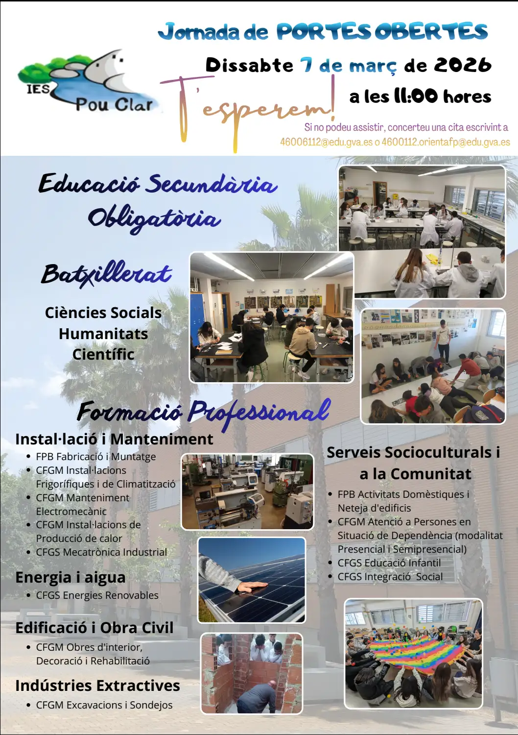 NOVA OFICINA D’INFORMACIÓ I ORIENTACIÓ PROFESSIONAL El centre disposarà a partir d’aquest curs, d’una oficina d’informació per a la nova Formació Professional a la disposició d’aquelles persones interessades, sent a més a més, l’oficina de referència per a tota la Vall d’Albaida. El correu de contacte és: 46006112.orientafp@edu.gva.es