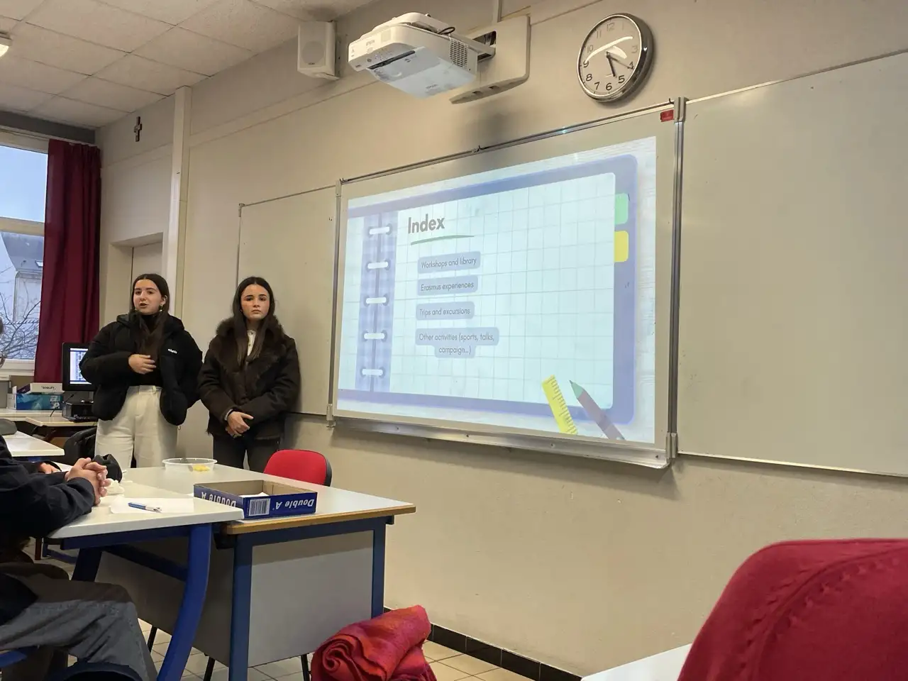 Tras conocer y disfrutar de la compañía de las familias francesas con quienes se hospedan durante esta aventura, el lunes 26 de enero acudieron por primera vez al Lycée Notre Dame d’Espérance, de Saint-Nazaire, donde estudian sus compañeras francesas. Fueron recibidas por el Director Adjunto, Xavier Roman y la profesora de castellano Maria Lesage, quienes les mostraron sus instalaciones y explicaron la historia de su centro educativo.