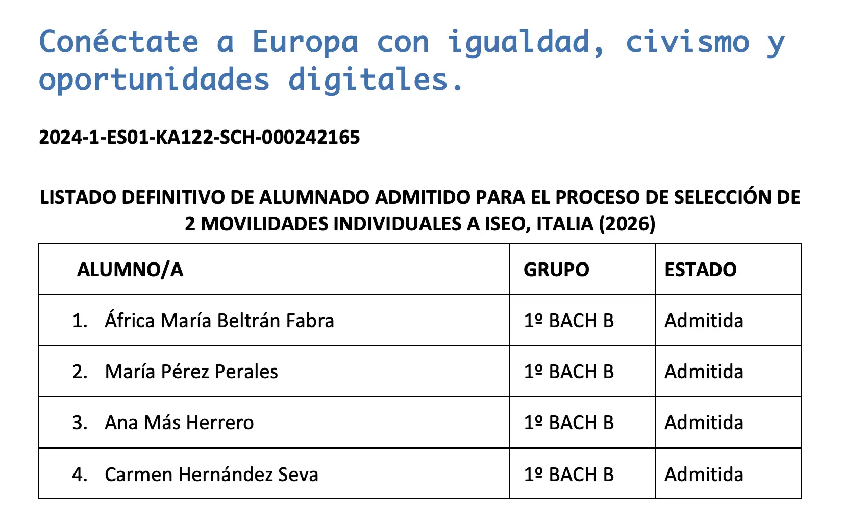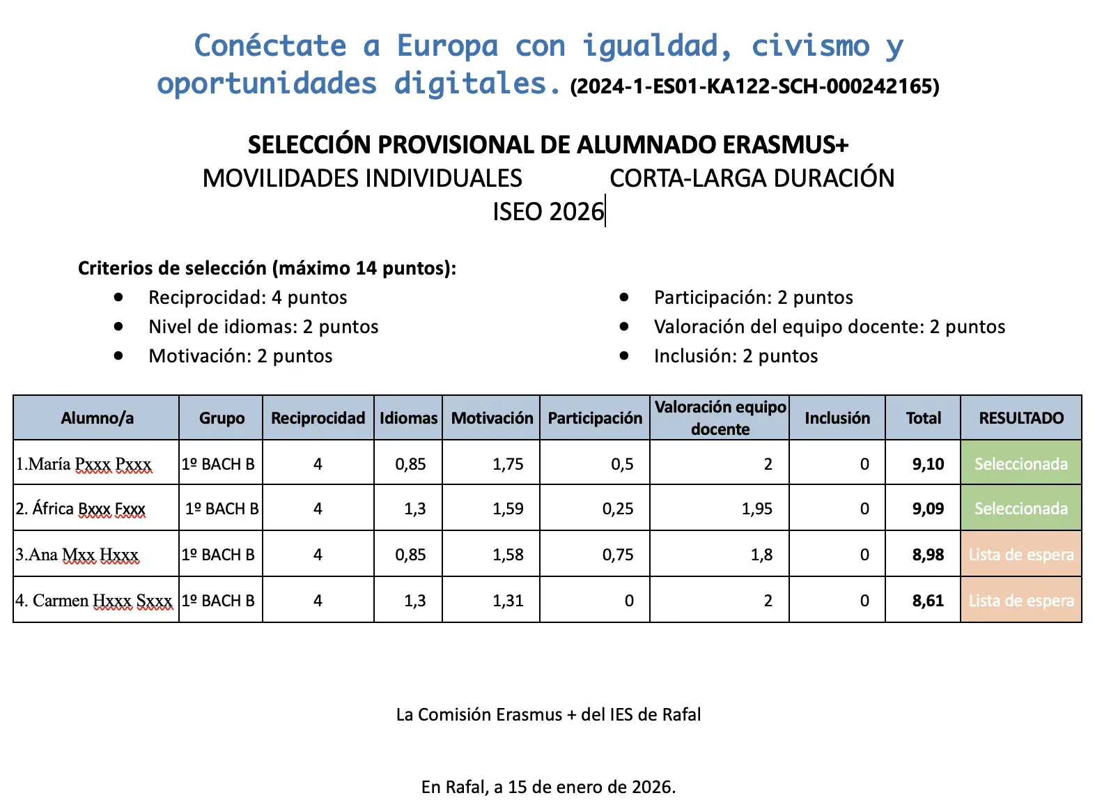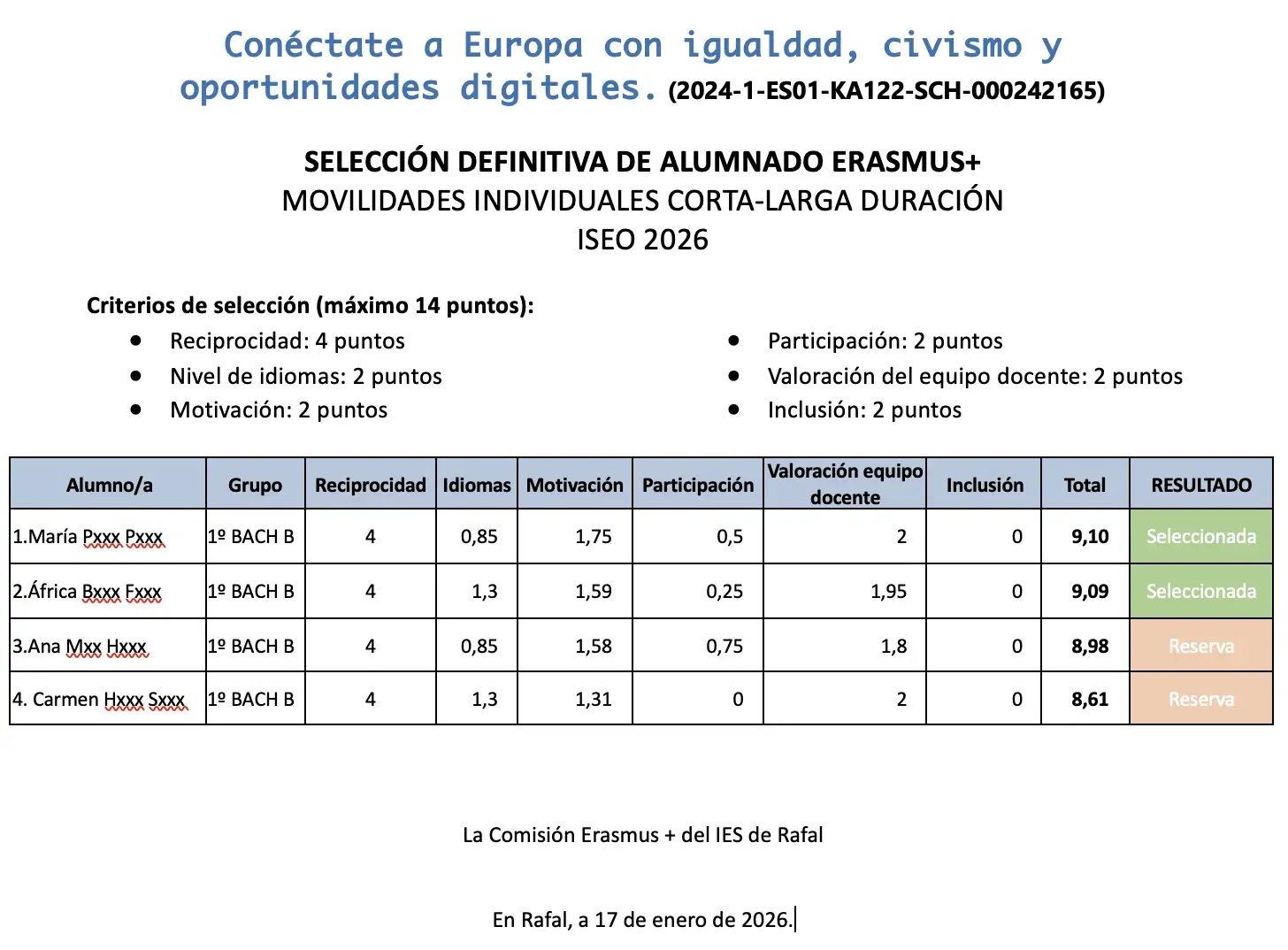 Esta experiencia se enmarca dentro del proyecto de Erasmus+ que lleva por título Conéctate a Europa con igualdad, civismo y oportunidades digitales, que se completará con la visita a Rafal de estudiantes y profesores franceses en abril.