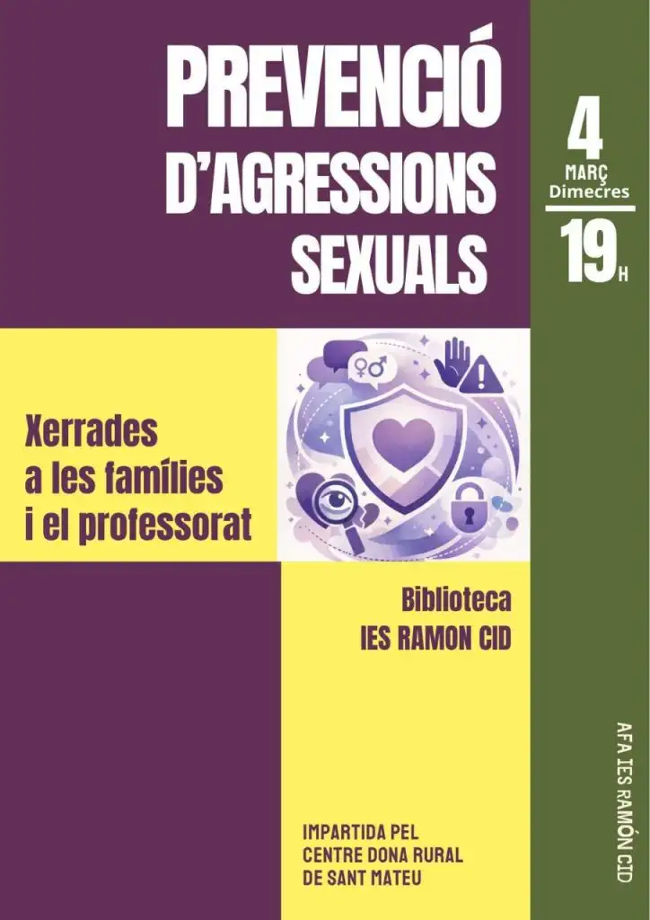 La AFA del centro ha organizado dos charlas sobre agresiones sexuales e impacto de la pornografía para los días 4 de marzo y 4 de mayo. Están abiertas a todas las personas que estéis interesadas.