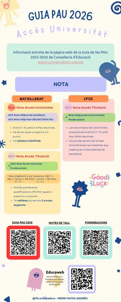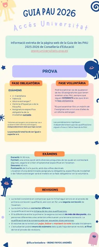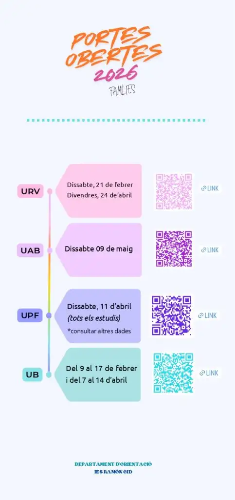 Aquí os dejamos una infografía sobre las pruebas PAU 2026 preparada por el departamento de Orientación del centro. También la podéis encontrar en la sección del departamento a la cual podéis acceder con el enlace que tenéis en la columna de la derecha de la web. Haced clic encima para descargarla en formato pdf.