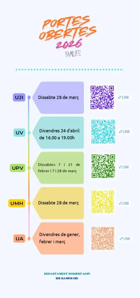 Las Universidades de la Comunidad Valenciana y de Cataluña han programado un serie de jornadas de puertas abiertas para las familias y futuros estudiantes. Aquí os dejamos los calendarios de estas jornadas y unos enlaces para consultar información. Si hacéis clic en las imágenes podréis descargar el calendario en formato pdf.