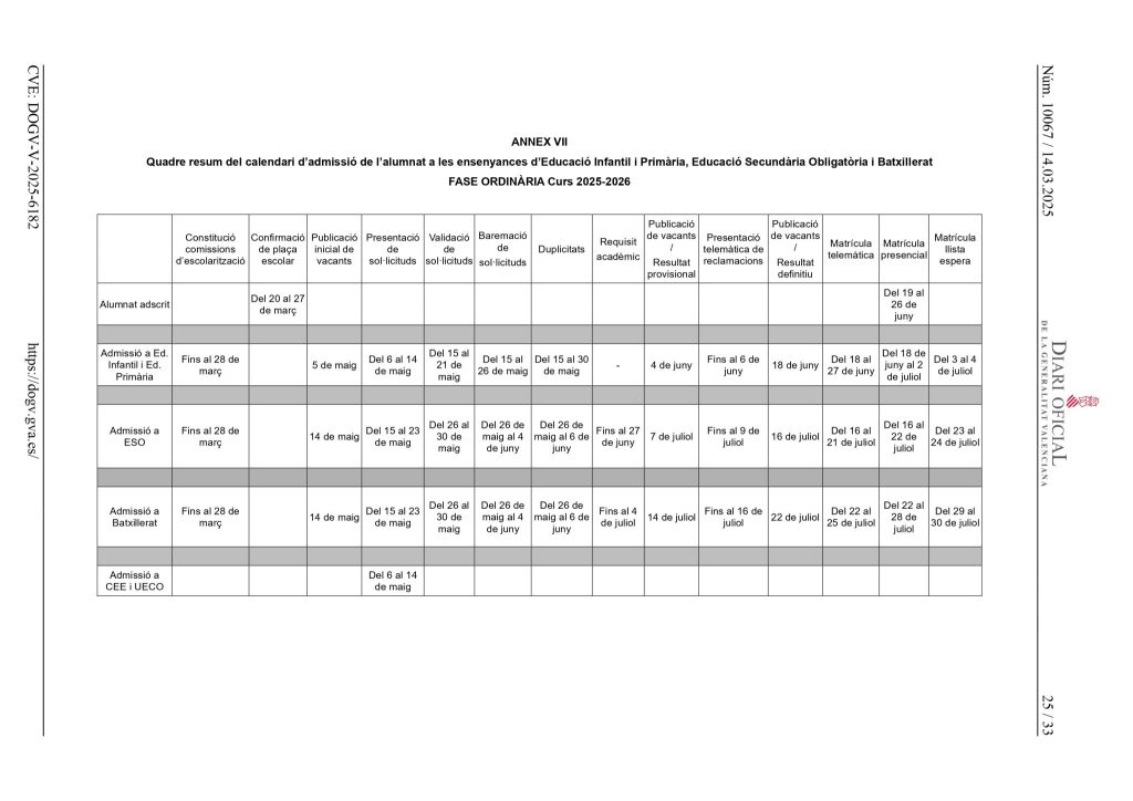 RESOLUCIÓ de 12 de març de 2025, de la Direcció General de Centres Docents, per la qual s’establix el calendari i es dicten instruccions respecte al procediment d’admissió de l’alumnat en els centres docents sostinguts amb fons públics de la Comunitat Valenciana que impartixen ensenyances d’Educació Infantil, Educació Primària, Educació Secundària Obligatòria i Batxillerat, i en els centres d’Educació Especial, per al curs 2025-2026. https://dogv.gva.es/datos/2025/03/14/pdf/2025_6182_va.pdf