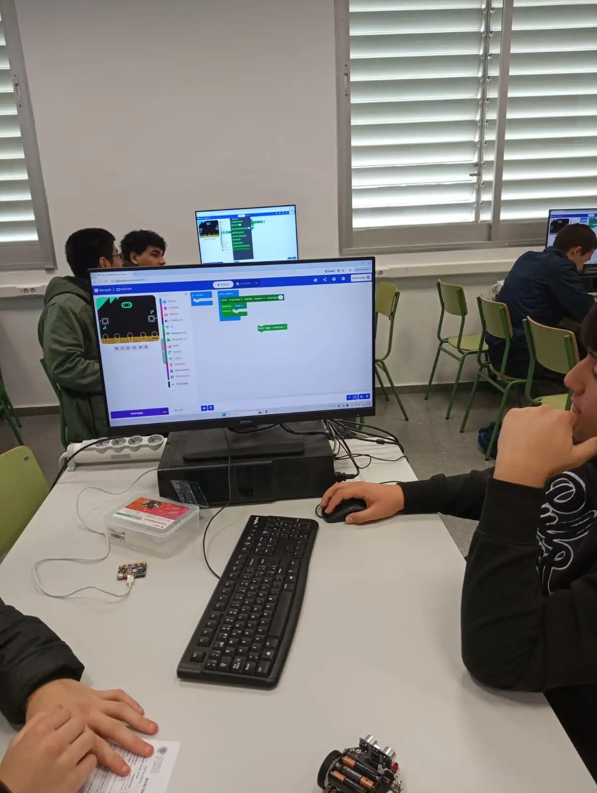 A continuació, van ser acompanyats a una aula de l’Escola d’Informàtica, on va donar principi l’esperat taller de robòtica. Allí van treballar amb la targeta micro:bit, un dispositiu molt utilitzat per a iniciar-se en la programació. Mitjançant un sistema de blocs interactius, cada grup va programar la placa i la va acoblar a un xicotet vehicle robòtic. L’objectiu inicial era crear un joc de ping-pong, utilitzant el robot com a “pilota” que havia de moure’s seguint una sèrie d’instruccions.