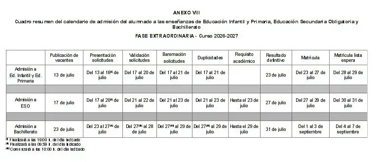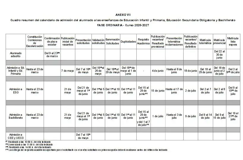 CALENDARIO DE ADMISIÓN A ESO Y BACHILLERATO PARA EL CURSO 2026-27
