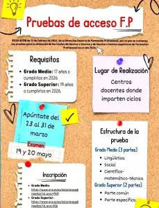 - PRUEBAS DE ACCESO A CICLOS FORMATIVOS 2026Enlace en la página web de la Consellería de Educación, cultura y Deporte RESOLUCIÓN de 13 de febrero de 2026, de la Dirección General de Formación Profesional, por la cual se convocan las pruebas de acceso a los ciclos formativos de grado medio y superior … Leer más