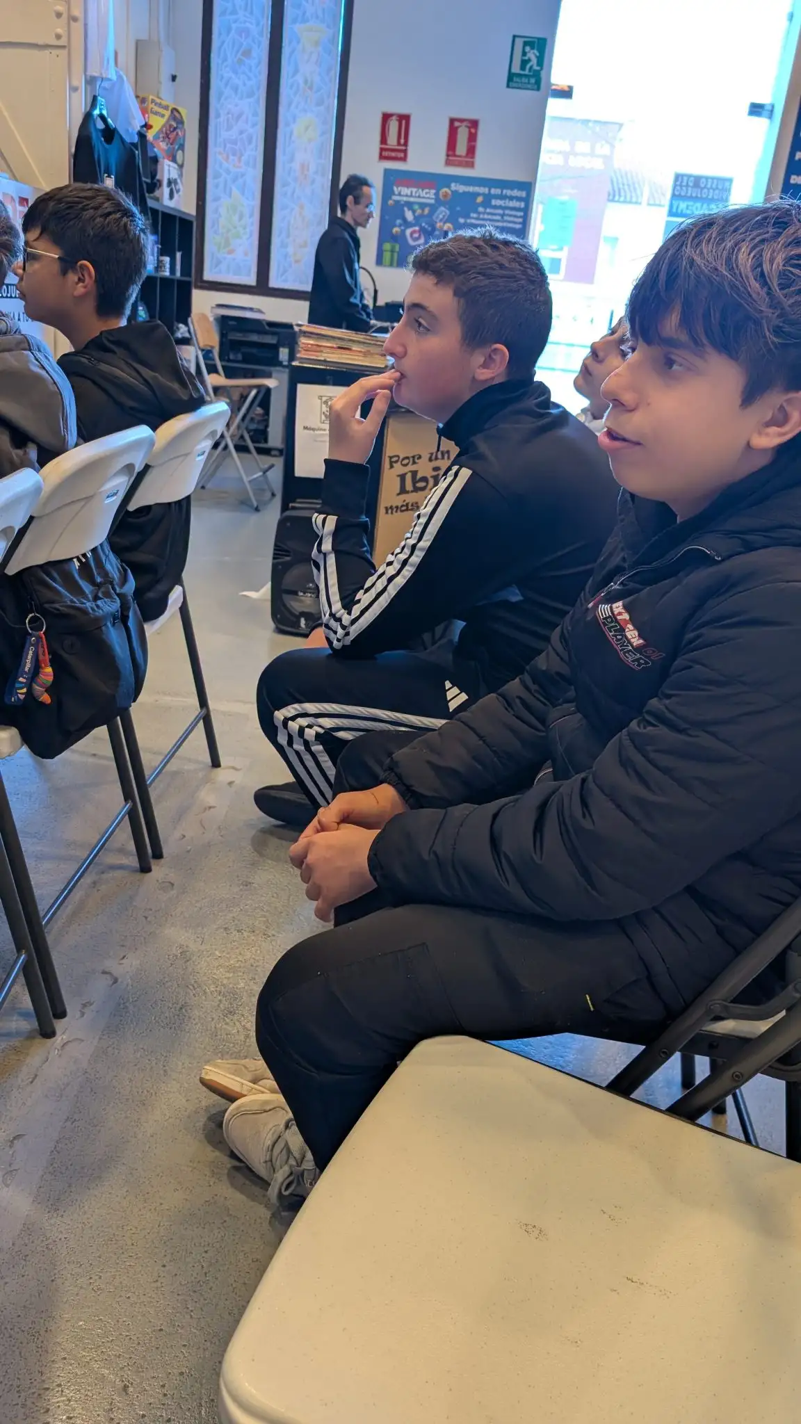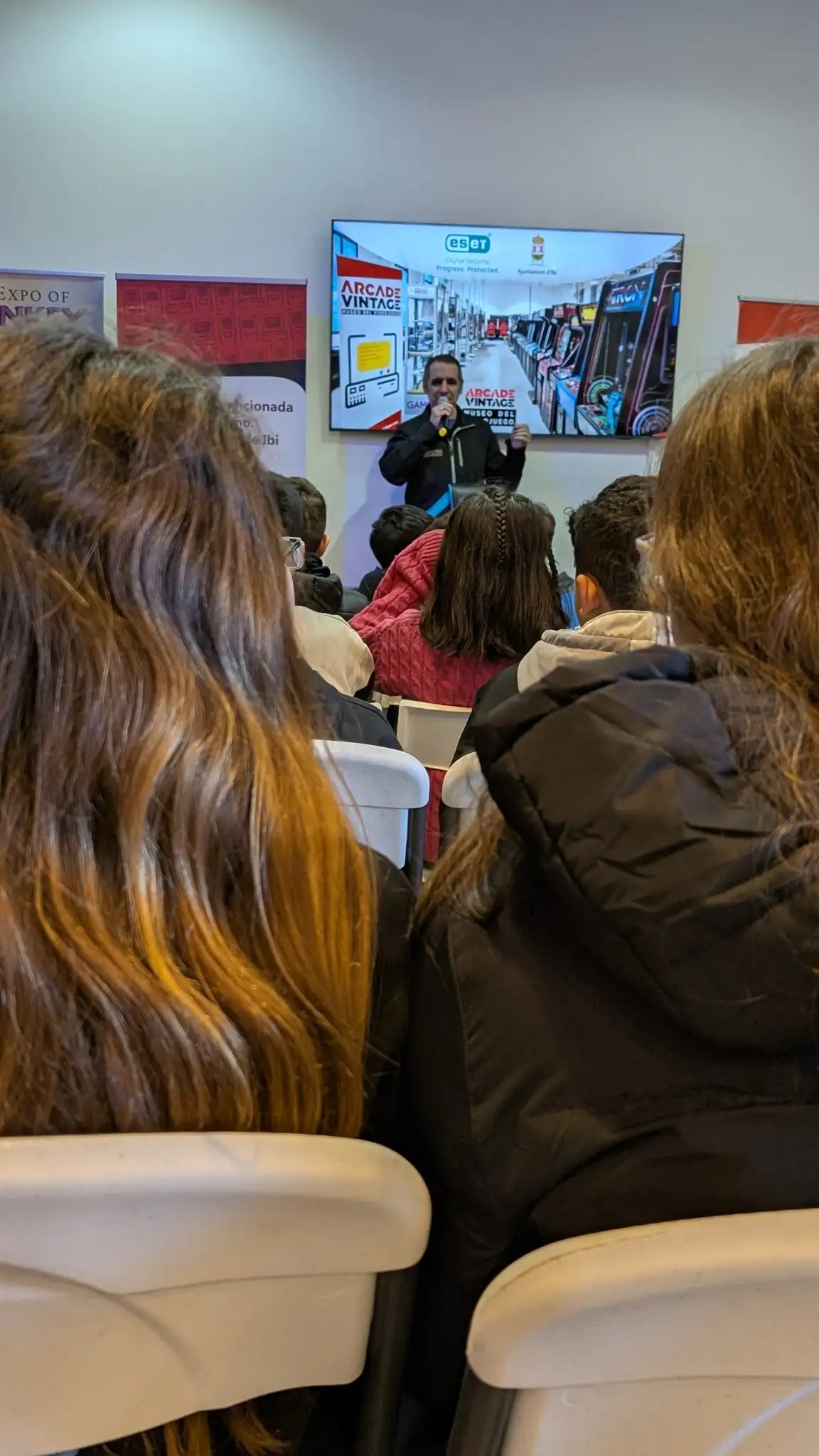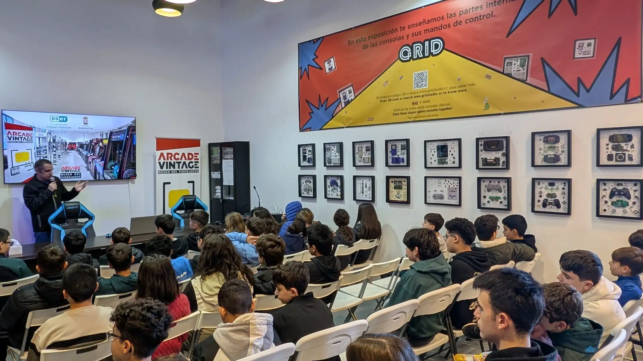 Después de almorzar, comenzaron la visita escuchando una pequeña explicación del Museo y la Fábrica Rico y una charla sobre el uso responsable de los videojuegos, a la que le siguieron un par de vídeos sobre la historia de los videojuegos, desde sus orígenes hasta la aparición de la Playstation 1. Durante las 2 horas y media restantes disfrutaron jugando con todo tipo de videojuegos arcade, simuladores, sistemas informáticos, consolas y pinballs.