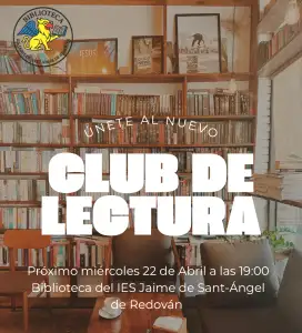 - ESTRENAMOS CLUB DE LECTURA EN EL IES JAIME DE SANT-ÁNGEL ABIERTO A TODA LA COMUNIDAD EDUCATIVANos complace anunciar la puesta en marcha de una nueva iniciativa en nuestro centro: el Club de Lectura del IES Jaime de Sant-Ángel de Redován, un espacio de encuentro abierto a toda la comunidad educativa en el que compartir el placer por la lectura, intercambiar ideas y disfrutar … Leer más
