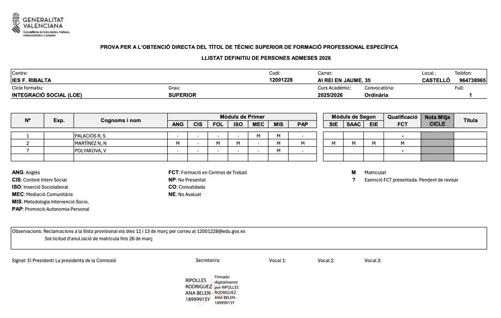 Listados definitivos de admitidos a las Pruebas Libres de FP