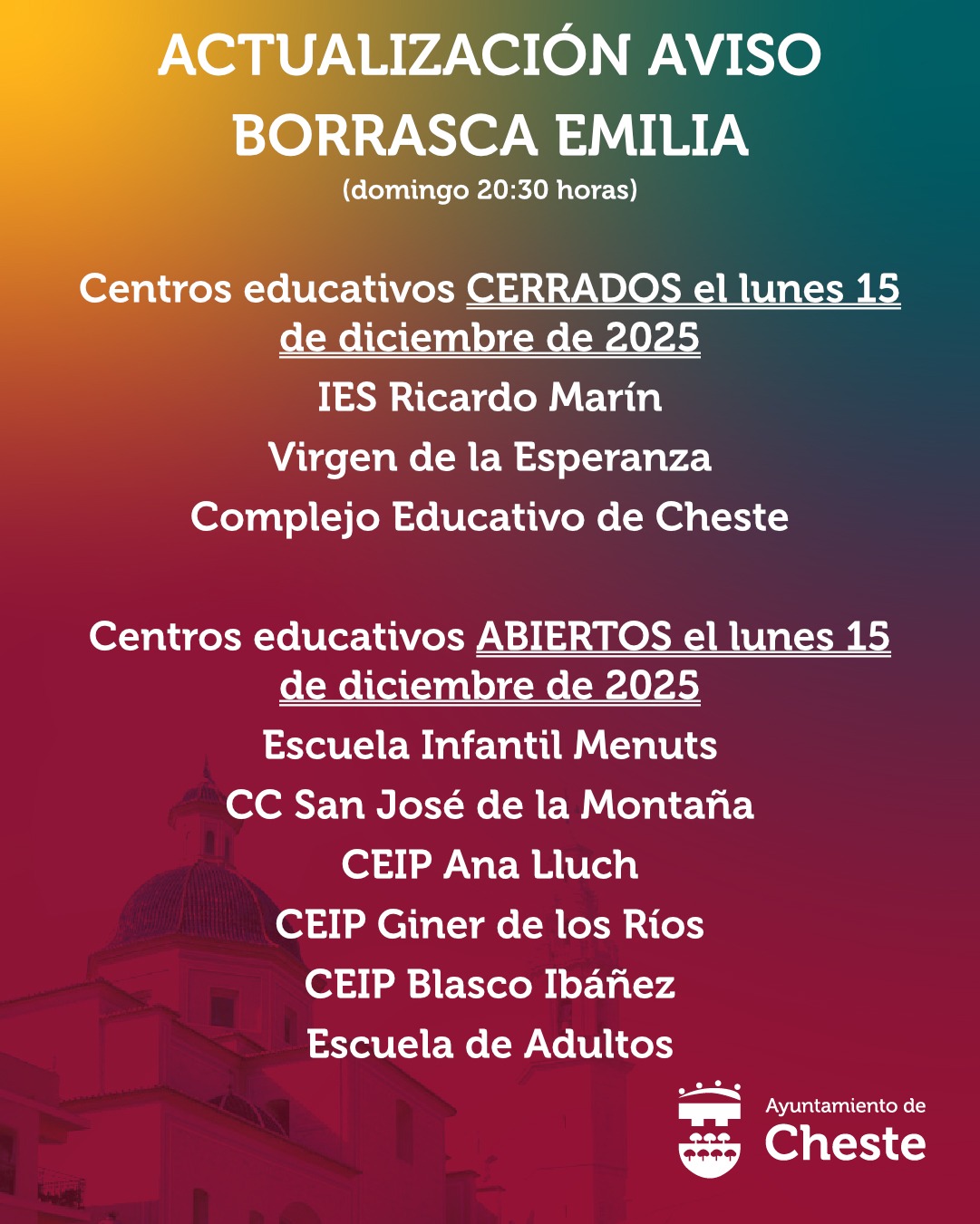 ℹ Seguint la guia de recomanacions als Ajuntaments davant fenòmens meteorològics adversos de la Generalitat Valenciana, asi com les circumstàncies específiques de cada centre, demà 15 de desembre de 2025: