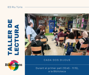 El passat dijous 16 d’octubre, encetàrem enguany el nostre Taller de Lectura IES Riu Túria a la nostra Biblioteca. Com fem des de fa tres anys, cada dos dijous ens reunim alumnat i professorat durant el primer pati (de 10:45 a 11:15) a la Biblioteca, per a parlar de llibres, de còmics, de pel·lícules…