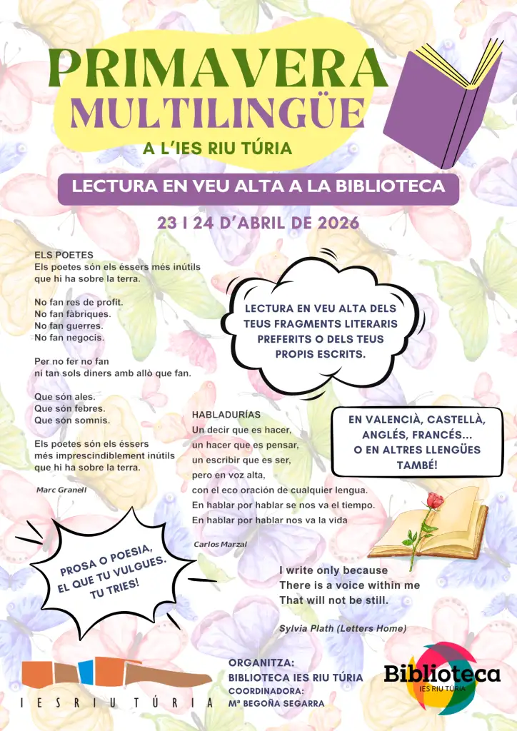 Pel que fa a la lectura lliure en veu alta del divendres 24 d’abril, serà un activitat grupal i hi haurà dos classes al mateix temps a la biblioteca, des de les 8:55 fins a les 14:00. El temps màxim per a cada lector/a serà més o menys de tres minuts. També podrà participar professorat, personal no docent, l’AMPA… Es tracta de fer una lectura en veu alta dels fragments literaris preferits de cada lector/a o dels seus propis escrits. Pot ser prosa o poesia, cadascú tria el que vol. Es pot llegir de manera individual, per parelles o per trios. Es podrà llegir en anglés, valencià, castellà, francés o en una altra llegua també, perquè és una Primavera Multilingüe, és a dir, lliurement cada lector triarà la llengua i el text. Bastaria simplement que, en acabar de llegir el seu text, el lector/a llegira la traducció quan no fóra ni en valencià ni en castellà, o bé un altre company/a llegira la traducció.