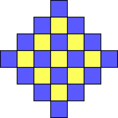 Aquest model està format per rajoles blaves i groges. La seva amplada és de 7 rajoles. Al pati d’un institut hi ha un com aquest amb una amplada de 149 rajoles.