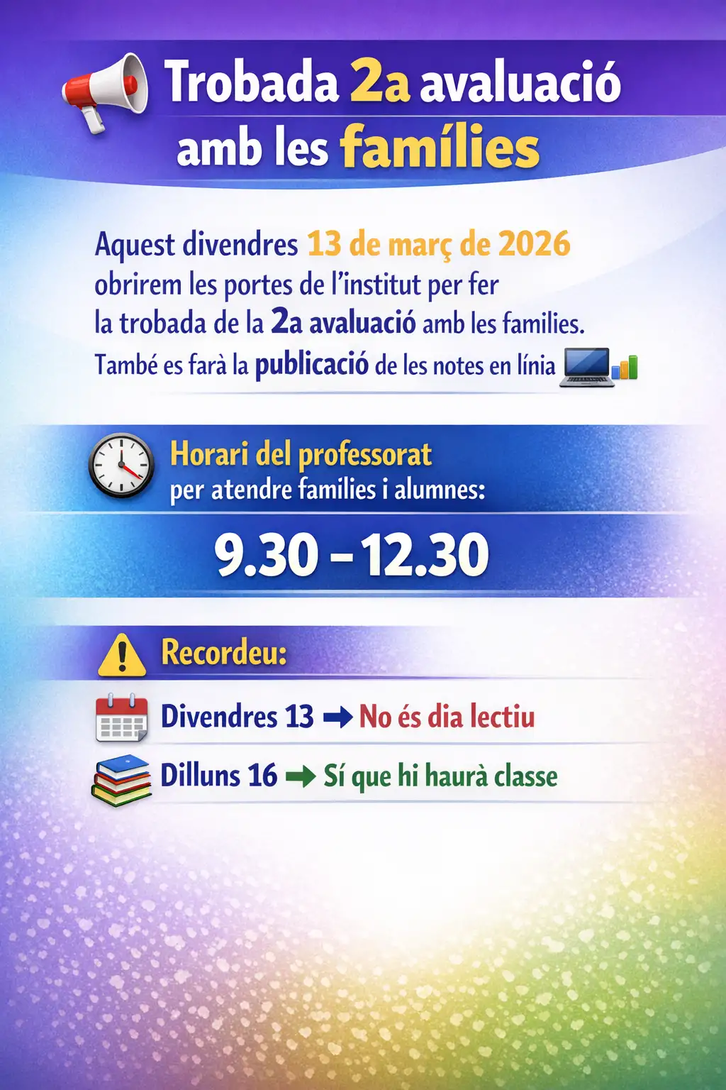 📢 Trobada 2a avaluació amb les famílies Aquest divendres 13 de març de 2026 obrirem les portes de l’institut per fer la trobada de la 2a avaluació amb les famílies. També es farà la publicació de les notes en línia 💻📊 🕘 Horari del professorat per atendre famílies i alumnes:9.30 – 12.30 ⚠️ Recordeu:📅 Divendres … Llegir més