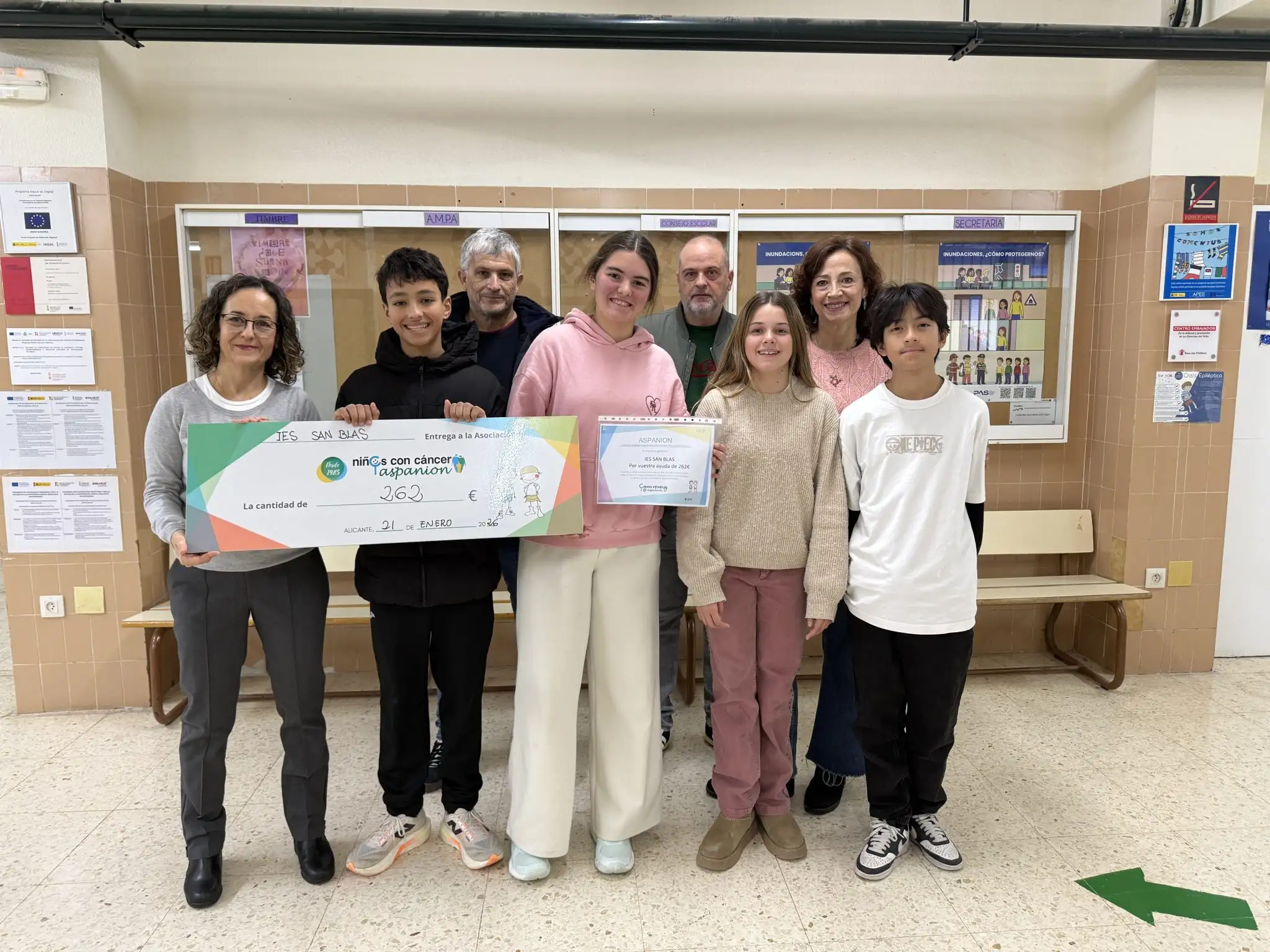 L’alumnat de 1r d’ESO que cursa la matèria d’Atenció Educativa juntament amb alumnat de 2n d’ESO de la matèria d’Emprenedoria Social i Sostenible (i amb la col·laboració i guia dels professors i professores Emilio Vercher, Mª Jesús Peral, Pilar Martínez i Jose María García, a més de la inestimable ajuda en la venda de tiquets del nostre conserge, Josep Martí) va participar en un mercat ambulant solidari en el qual es van oferir productes dissenyats i pensats per ells i elles mateixes, produïts amb material reciclat i reutilitzat i la venda del qual tenia una finalitat solidària. Tant professorat com alumnat del nostre centre va col·laborar activament en esta iniciativa amb la compra d’estos productes. D’esta manera vam poder recaptar la quantitat de 262 euros que van ser donats a ASPANION, Associació de Pares de Xiquets Oncològics d’Alacant. Dimecres passat 21 de gener, una representació de l’alumnat i del professorat, va fer efectiva la donació a una representant d’ASPANION. Més enllà de la quantitat recaptada, la importància d’esta mena d’iniciatives és la contribució perquè l’alumnat siga més conscient de la importància de la solidaritat en la societat actual. Gràcies a tots i totes les participants en esta iniciativa.