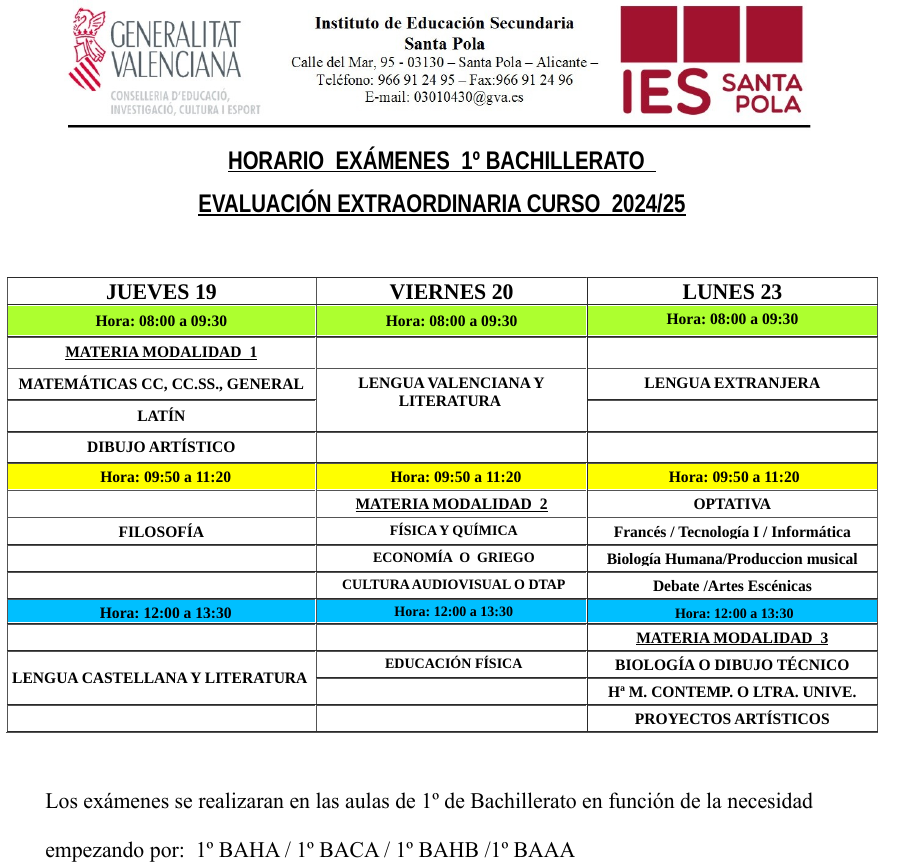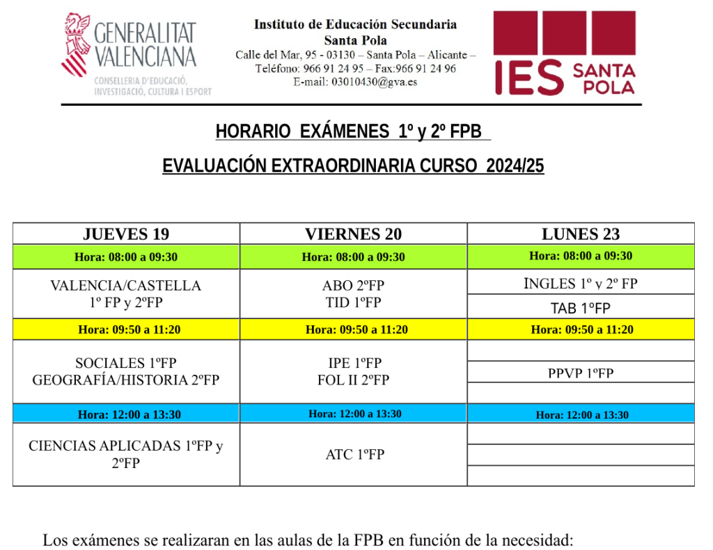Los próximos días jueves 19, viernes 20 y lunes 23 de junio se realizarán las pruebas extraordinarias de 1º de bachillerato, 1º y 2º FPB en el IES Santa Pola.