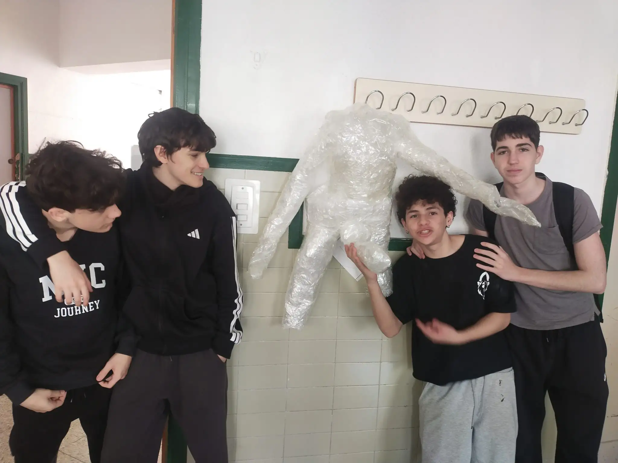 Les escultures estan realitzades amb film transparent de cuina i rotllos de celo de 5cm d’ample. També s’ha realitzat una presentació en PDF del procés d’escultura i individualment han realitzat un cartell per donar a coneixer l’exposició d’escultures que està montada en l’aula de plàstica.