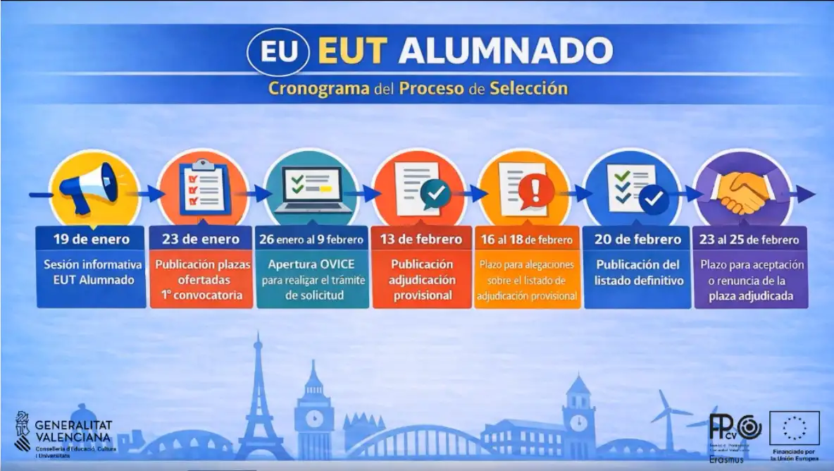 S’ha publicat l’oferta de places del programa Eurotrainee Alumnat.En esta fase s’oferixen 607 places dirigides a l’alumnat de cicles formatius de grau mitjà i de grau … Llegir més